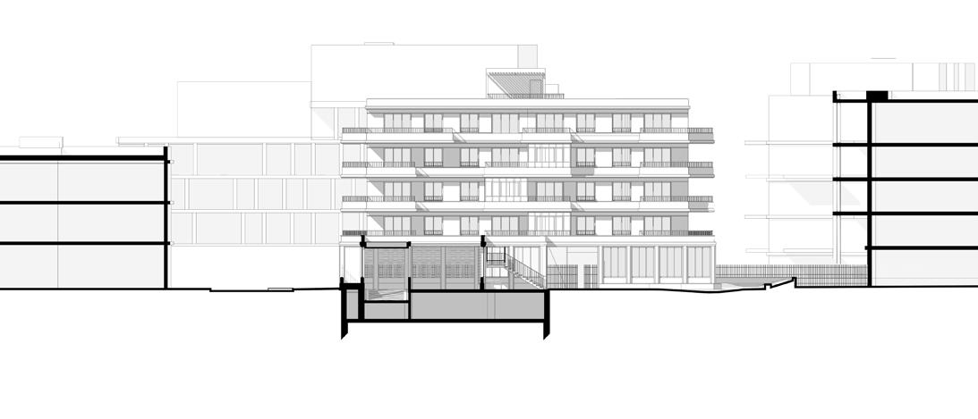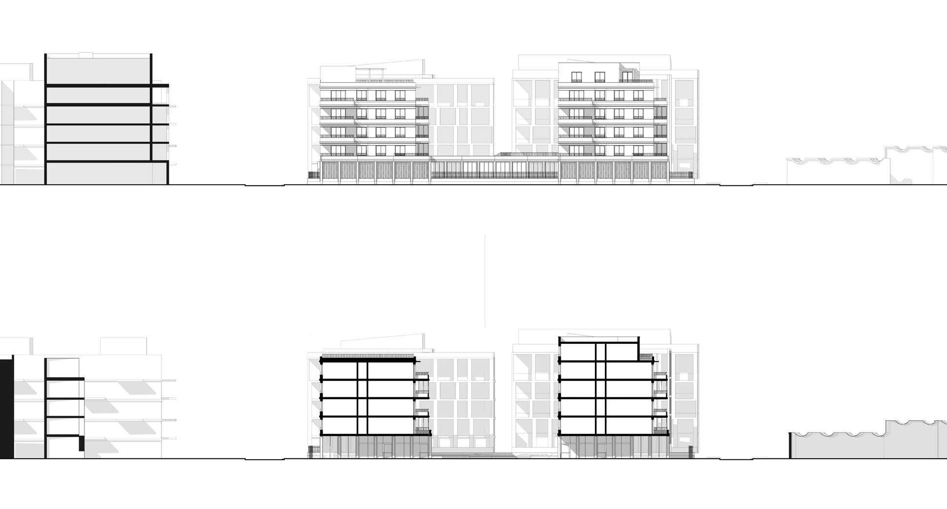 La partie nord du bâtiment constitue un front urbain rythmé par une volumétrie à redent le long de l ’axe routier, lisible à travers la trame végétale.
