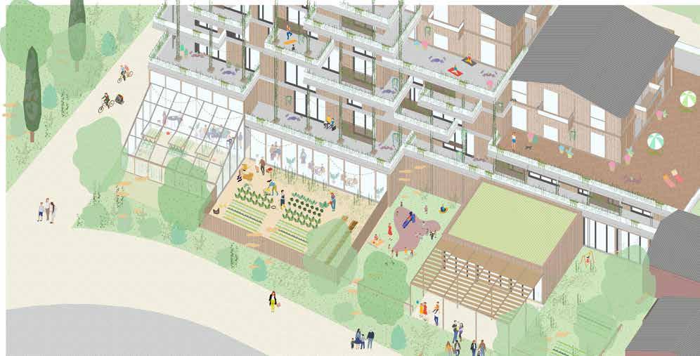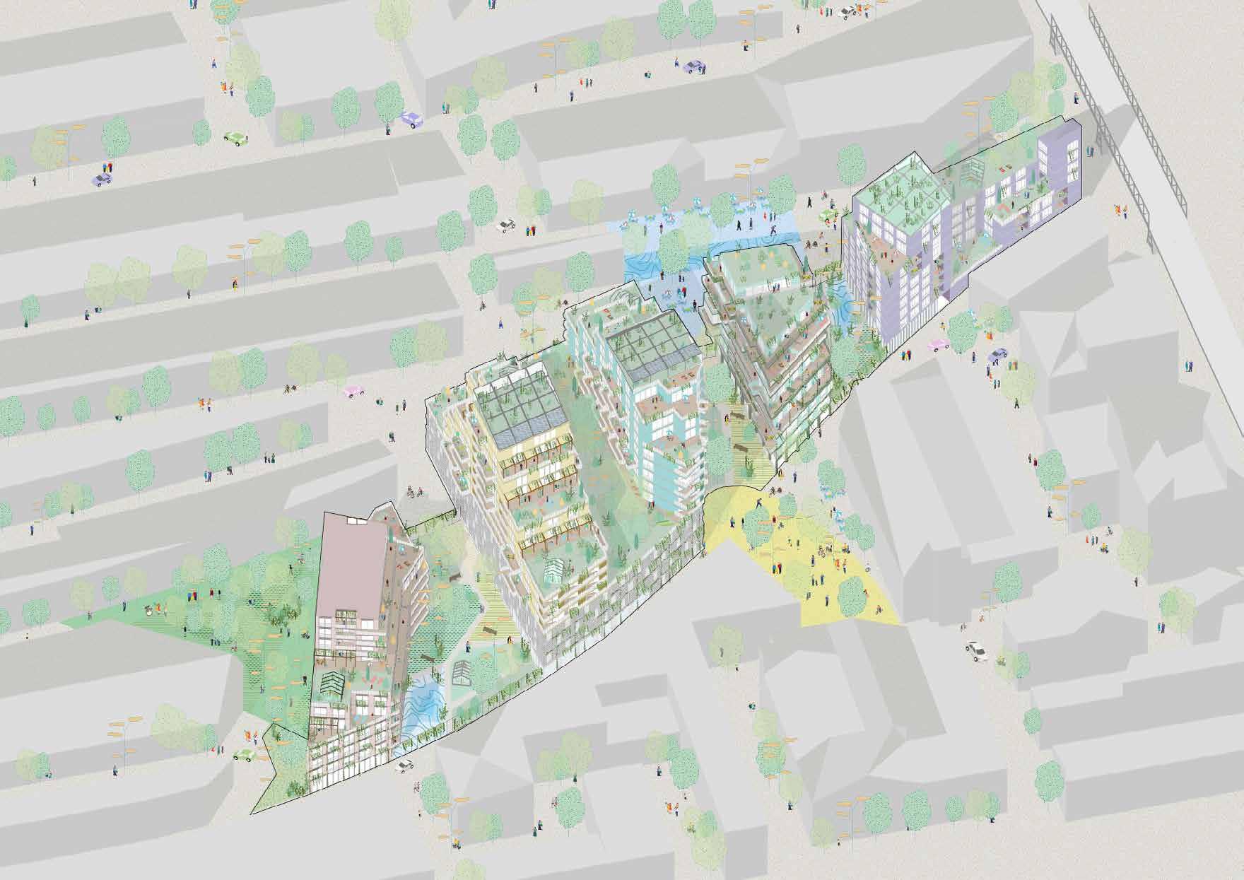 Nous proposons un parti bioclimatique fort, avec une densité qui laisse respirer le sol, une transition douce des hauteurs de l’avenue Salengro, des espaces paysagers et publics fédérateurs (le parc et la coulée verte), une programmation mixte qui permet une implication populaire, et une perméabilité piétonne.
