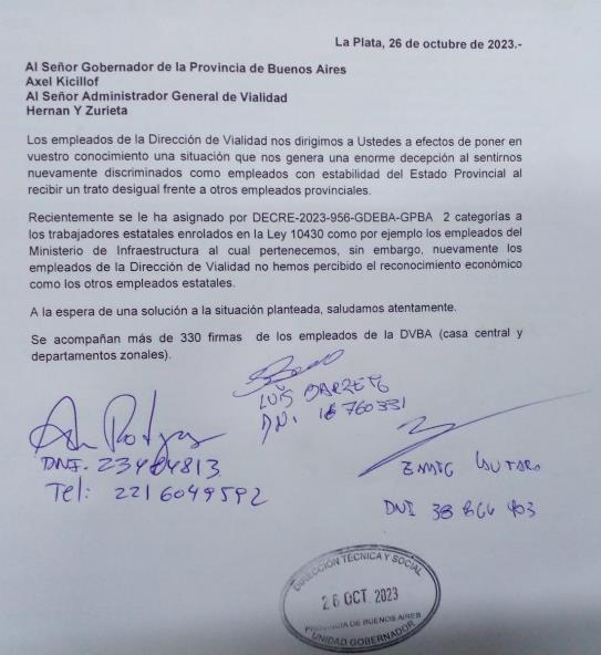 Los trabajadores de vialidad hemos recibido la noticia de una nueva reubicación del personal, saludamos esta decisión que fue fruto entre otros motivos del reclamo de muchos trabajadores y trabajadoras que hicimos a través de expedientes y petitorios con más de 330 firmas ( 26-10-2023) que presentamos al administrador de Vialidad como así también al gobernador de la provincia Axel Kicillof. Felicitamos a todos los compas que apoyaron esta construcción desde las bases recorriendo oficina por oficina para juntar las firmas por este reclamo justo. Cabe aclarar que la última reubicación del personal vial se dio en agosto del 2015. A continuación, el documento oficial con los detalles de la propuesta