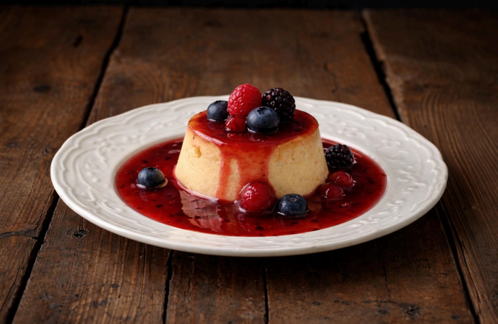 Calienta la leche con el azúcar y añade el Queso do Cebreiro, mezclando suavemente hasta obtener una crema homogénea. Bate la nata junto con las yemas e incorpora esta mezcla a la leche templada y colada. Vierte la preparación en flaneras caramelizadas e introduce al baño María en el horno a 160 °C, durante unos 60 minutos, hasta que el flan cuaje con una textura suave y sedosa. Adorna al gusto con la salsa y los frutos rojos.