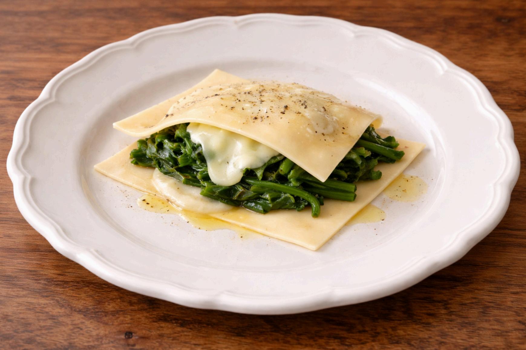 Escalda los grelos y saltéalos suavemente con un poco de aceite y los dientes de ajo fileteados hasta que estén tiernos y sabrosos. Cuece las láminas de pasta fresca en agua con sal y escúrrelas con cuidado, manteniéndolas calientes. Sobre una lámina de pasta coloca uan base de queso, un lecho de grelos y distribuye encima más láminas generosas de Arzúa-Ulloa. Introduce el conjunto en el horno precalentado a 160–170 °C durante 1–2 minutos, lo justo para que el queso comience a fundirse suavemente. Retira del horno y cubre con la segunda lámina de pasta, creando el efecto de ravioli abierto. Termina con un hilo de aceite de oliva virgen extra y un toque de pimienta recién molida. y nuez moscada.