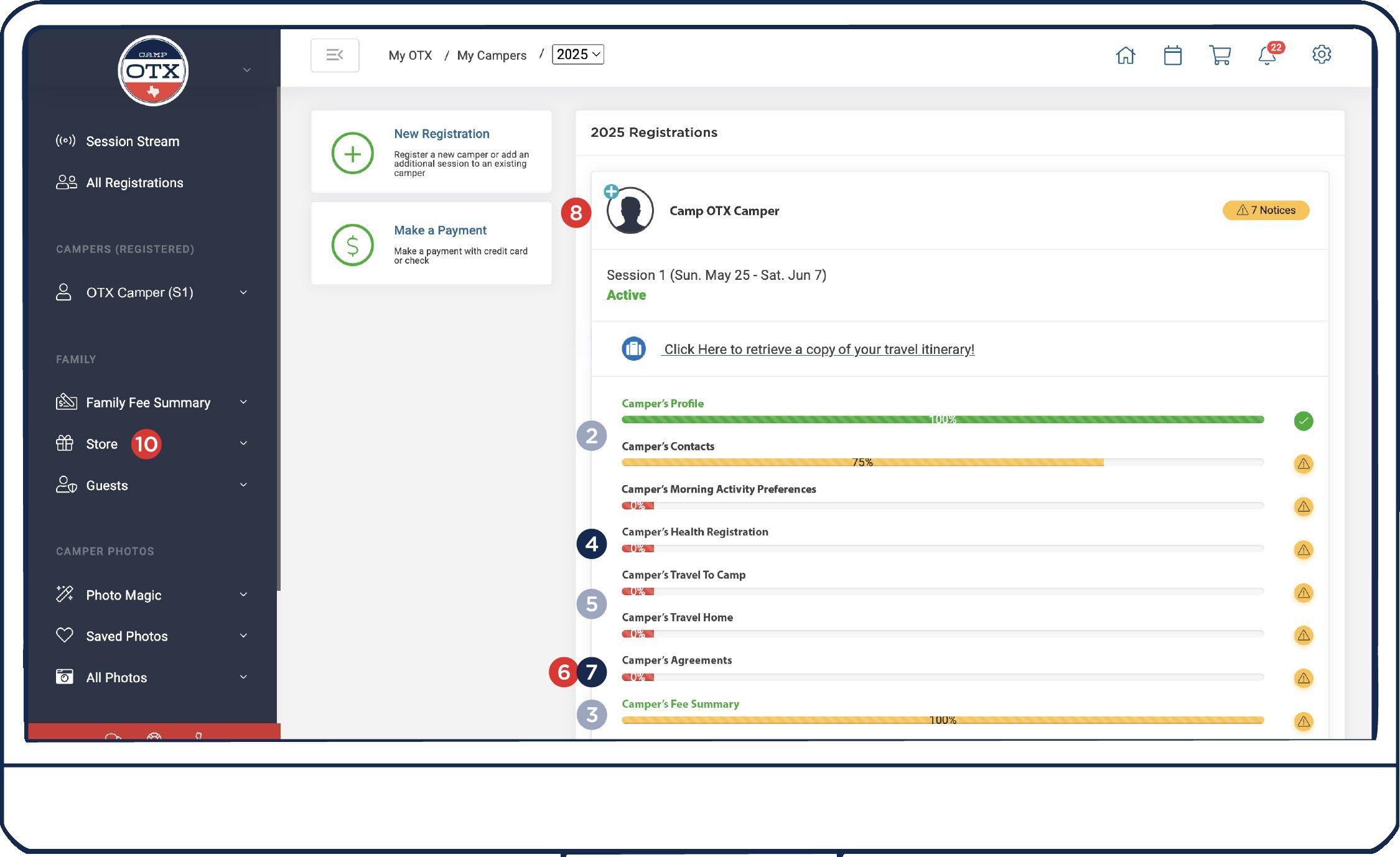 Prepare for camp by completing the camper profile, family contacts, health registration, and travel sections, as well as designating Morning Activity preferences, on your myOTX dashboard. During the session, this is the hub of information about your camper’s experience.