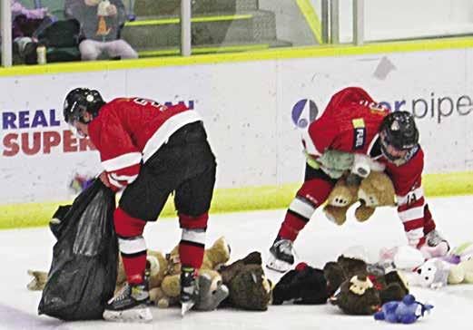 Lori Larsen, Camrose Booster Camrose Kodiaks players gathered up a slew of stuffed toys, toques and mittens that were thrown onto the ice during the December 3 game against the Okotoks Oilers. The goal was scored by local player Callum Gau “bearly” into the first period, 35 seconds to be exact. The annual Teddy Bear Toss game has become a heart warming tradition for residents of Camrose and area to give to those in need.