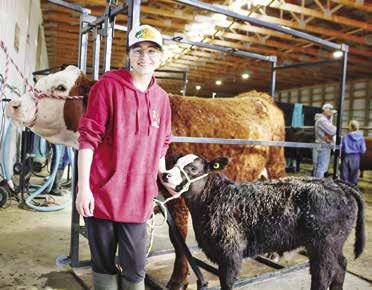 Lori Larsen, Camrose Booster Thirteen-year-old Khiley Bellamy gets ready to give her two-year-old purebred Hereford show cow, Penny, and adorable two-month old black Angus Hereford cross calf, Kenny, a quick blow dry before Penny’s show at the Hay Lakes show