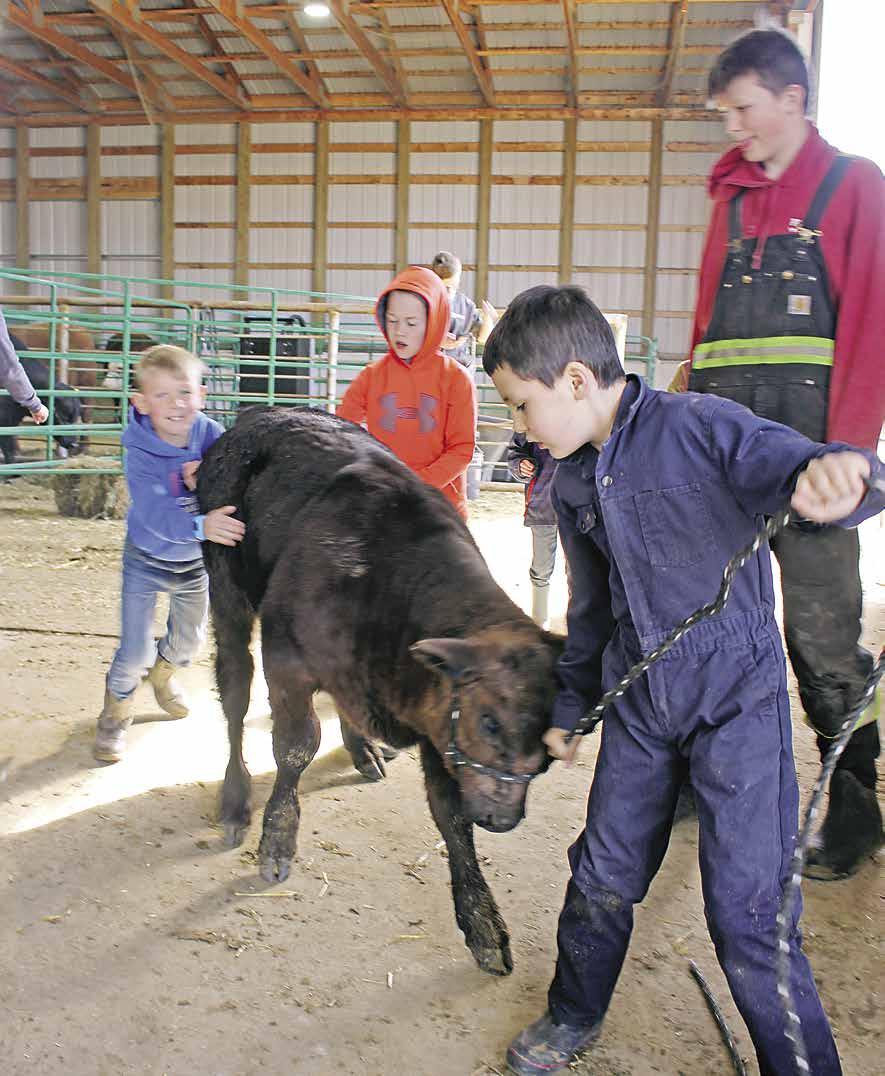 Camrose and District 4-H Beef Club member Brody Pouliot tugs on the lead line as he brings his Angus Gelbvieh calf to the wash station. Meanwhile, Blayne Burkhardt (left) and Jesse Feitsma (orange hoodie) help to bring up the rear, with Jerry Pouliot keeping a close eye on the action.