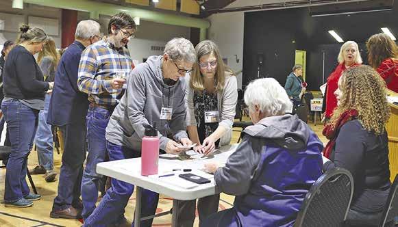 • Neighbourlink volunteers sat down to roll a mountain of coins from the “Pennies for People” Fundraiser. Churches in Camrose collected pennies for Neighbourlink’s Emergency Fund, which is used to assist individuals and families experiencing emergency situations. The campaign raised over $1,000 in coins collected by various congregations. Rolling coins around a table were: Ruth Grue, Margaret Church, Loreen Nilson, Aurora Erickson, Louise Forsythe, Blanche Hagen and Jean Daley