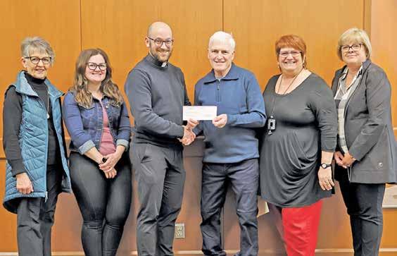 St. Francis Xavier Catholic Church made a donation to Pregnancy Care Canada. The organization is currently working on their goal of establishing a Pregnancy Care Centre in Camrose to help support women and families facing unexpected pregnancies. From left, Denise Zimmel, St. Francis Xavier Catholic Church social events team; Megan Howell, St. Francis Xavier Catholic Church social events team; Father Kristopher Schmidt; Ross Regan, member of the Pregnancy Care Canada steering committee; Dixie Schielke; and Koreen Cyre, St. Francis Xavier Catholic Church social events team.