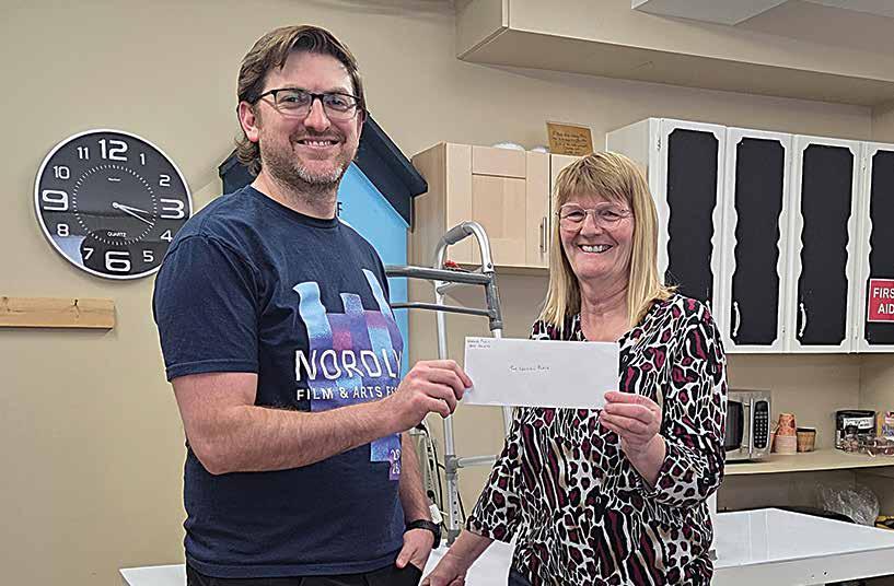 Nadine Leming, Camrose Booster Nordlys Film and Arts Festival collected donations at the coat check at the festival in February on behalf of the Battle River Lending Place. From left, Lucas Hudec from the Nordlys board presented Julie Girard, executive director of the Battle River Lending Place, $2,500 from the donations.