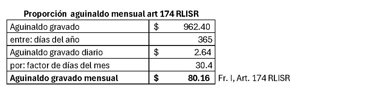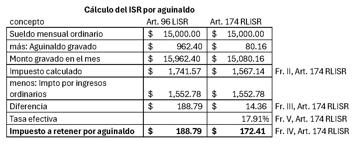 Ahora para la determinación del ISR que debemos retener, tenemos el artículo 96 de la Ley del Impuesto Sobre la Renta (LISR), donde sumaremos la parte gravada del aguinaldo a los demás ingresos acumulables, y como opción tenemos el artículo 174 del Reglamento de la Ley del Impuesto Sobre la Renta (RLISR), donde solo se acumulará la parte proporcional a un mes del aguinaldo y se determinará el factor a aplicar al total del aguinaldo gravado.