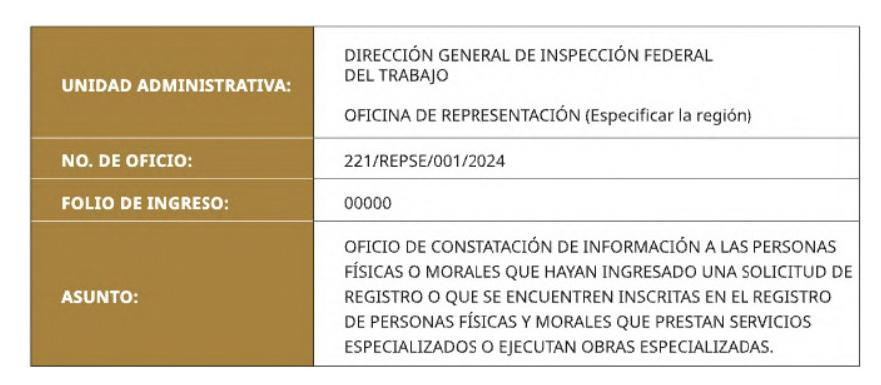 Los oficios de visitas de constatación REPSE, deberán emitirse de conformidad con las disposiciones normativas y con el encabezado siguiente: