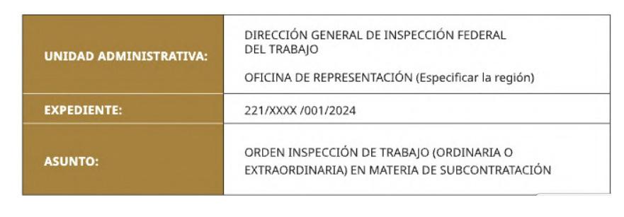 Las órdenes de inspección en materia de subcontratación deberán emitirse de conformidad con las disposiciones normativas a las atribuciones de la autoridad y con el encabezado siguiente: