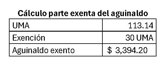 Antes del cálculo del impuesto, debemos considerar que hasta un monto equivalente a 30 Unidades de Medida y Actualización (UMA) no pagarán impuesto, si el monto del aguinaldo no lo supera, no se tendrá que calcular el impuesto, si lo supera, solo por el excedente que lo supere se deberá calcular el impuesto.