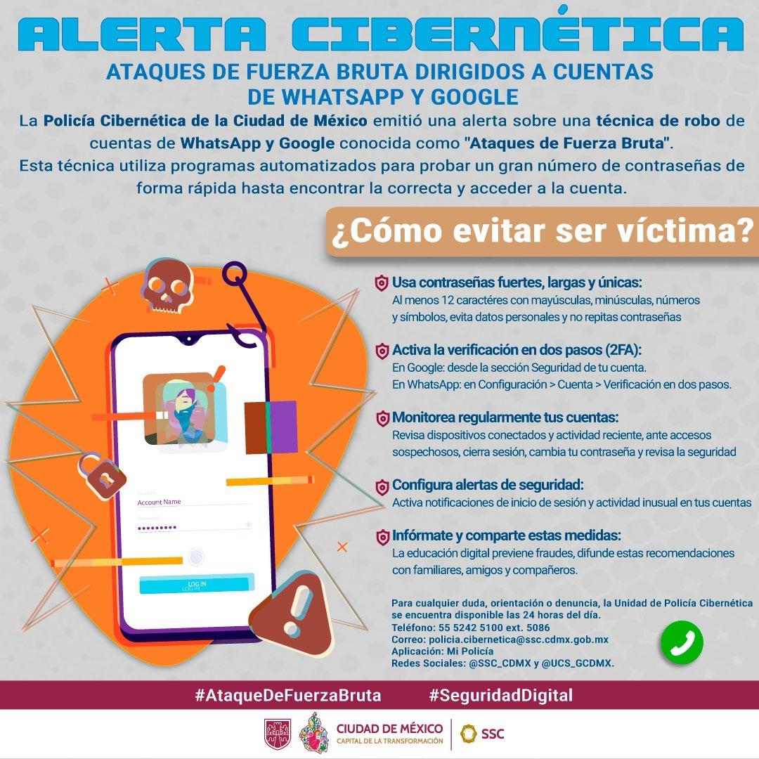La Unidad de Policía Cibernética, de la Secretaría de Seguridad Ciudadana (SSC) de la Ciudad de México, alerta a la ciudadanía, sobre intentos de robo de cuentas de WhatsApp y Google mediante “Ataques de Fuerza Bruta”, técnica que utiliza programas automatizados para probar miles de contraseñas en poco tiempo hasta encontrar la correcta.