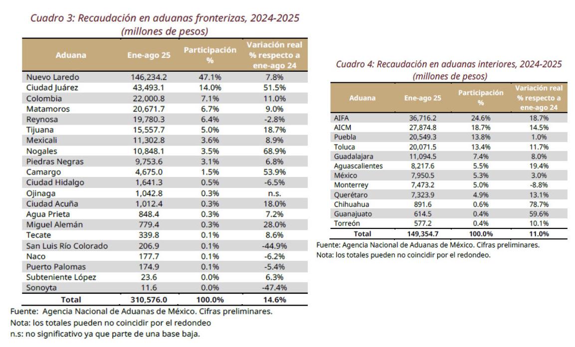 En las aduanas fronterizas, la recaudación aumentó 14.6% real respecto al mismo periodo de 2024. Nótese que las aduanas de Nuevo Laredo, Ciudad Juárez, Colombia, Matamoros y Reynosa obtuvieron el 81.2% del total de la recaudación de las aduanas fronterizas, colocándose entre las más importantes de este grupo.