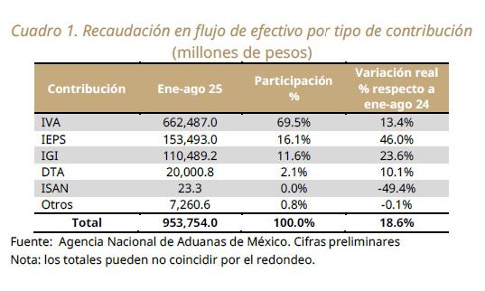 Desagregando por tipo de impuesto, en el periodo de enero-agosto de 2025 se observa lo siguiente: