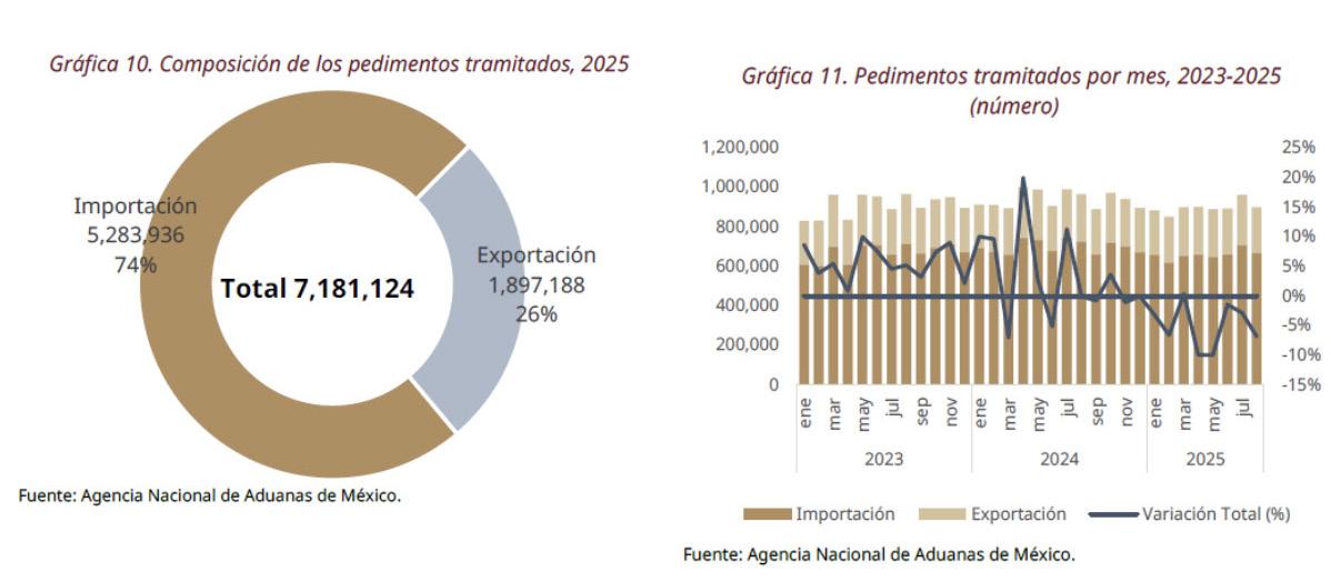 Para el periodo de enero-agosto de 2025 se han tramitado 7,181,124 pedimentos de los cuales 26.4% (1,897,188) fueron de exportación y 73.6% (5,283,936) de importación, que representan una disminución de 5.2% respecto del mismo periodo de 2024.