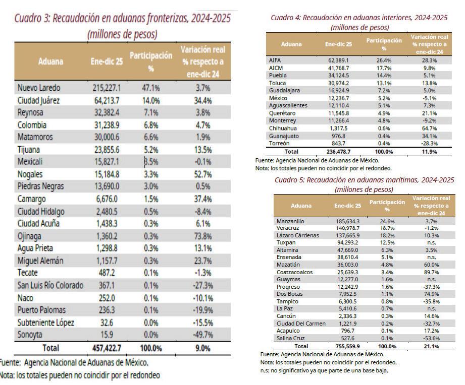 En las aduanas fronterizas, la recaudación aumentó 9.0% real respecto al mismo periodo de 2024. Nótese que las aduanas de Nuevo Laredo, Ciudad Juárez, Reynosa, Colombia y Matamoros obtuvieron el 81.6% del total de la recaudación de las aduanas fronterizas, colocándose entre las más importantes de este grupo.