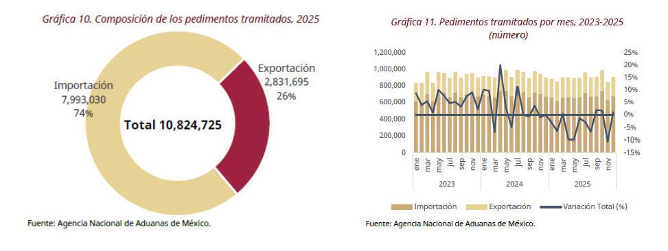 Para el periodo de enero-diciembre de 2025 se han tramitado 10,824,725 pedimentos de los cuales 26.2% (2,831,695) fueron de exportación y 73.8% (7,993,030) de importación, que representan una disminución de 4.0% respecto del mismo periodo de 2024.