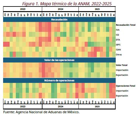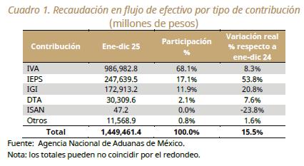 En el periodo de enero-diciembre de 2025, la recaudación en flujo de efectivo por operaciones de comercio exterior fue 1,449,461.4 millones de pesos, que representa un crecimiento de 15.5% real respecto al mismo periodo de 2024.