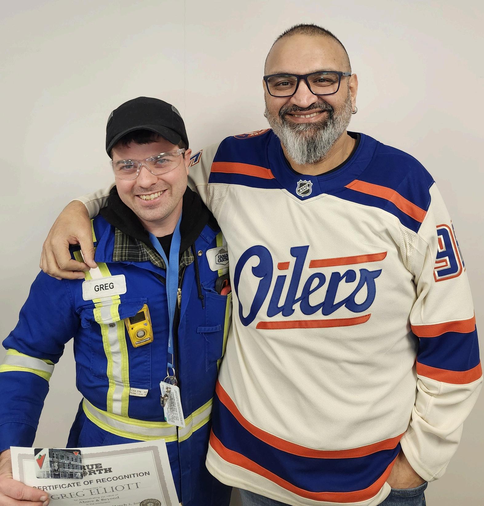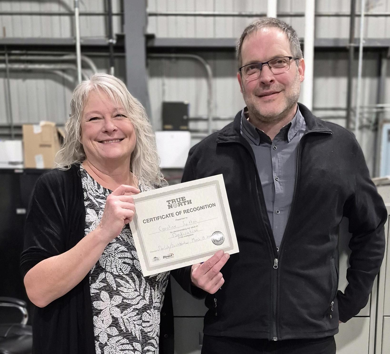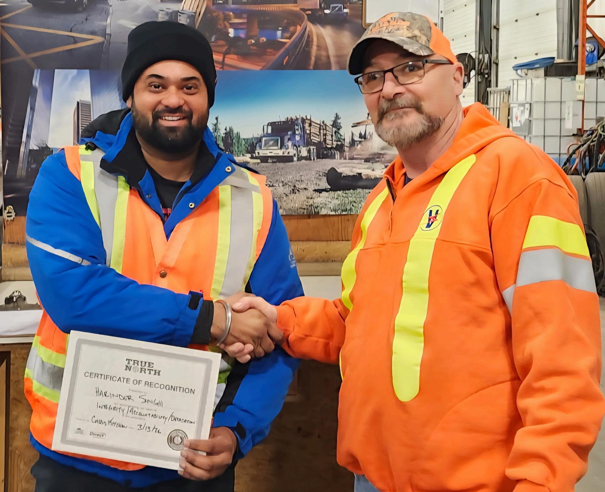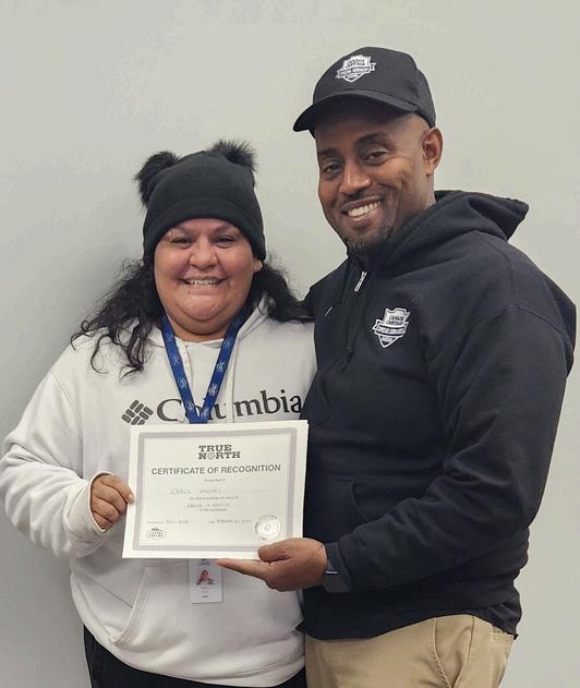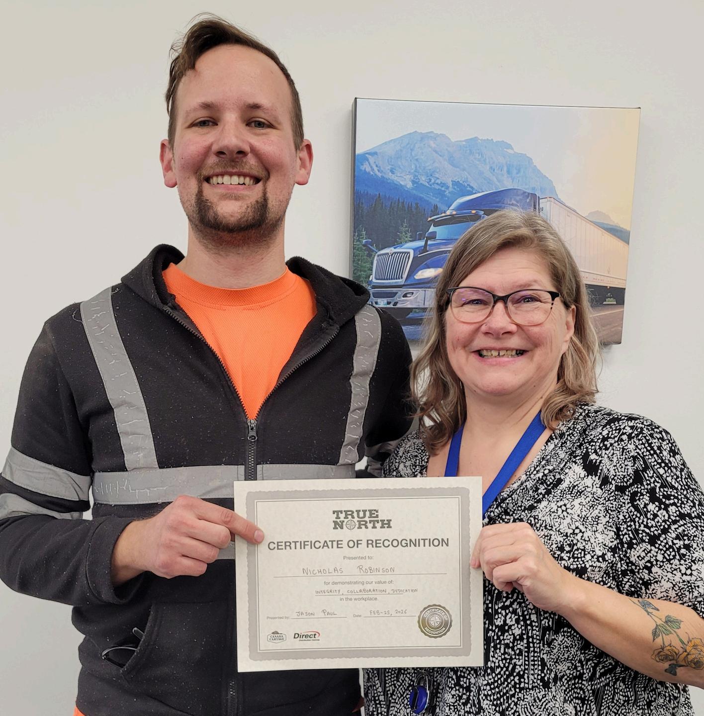 Operations Manager Audra Jeffs (right) presented Company Driver Nicholas Robinson with a True North Certificate for demonstrating our company ’ s values. Audra and Nicholas work out of our Calgary, Alberta terminal.