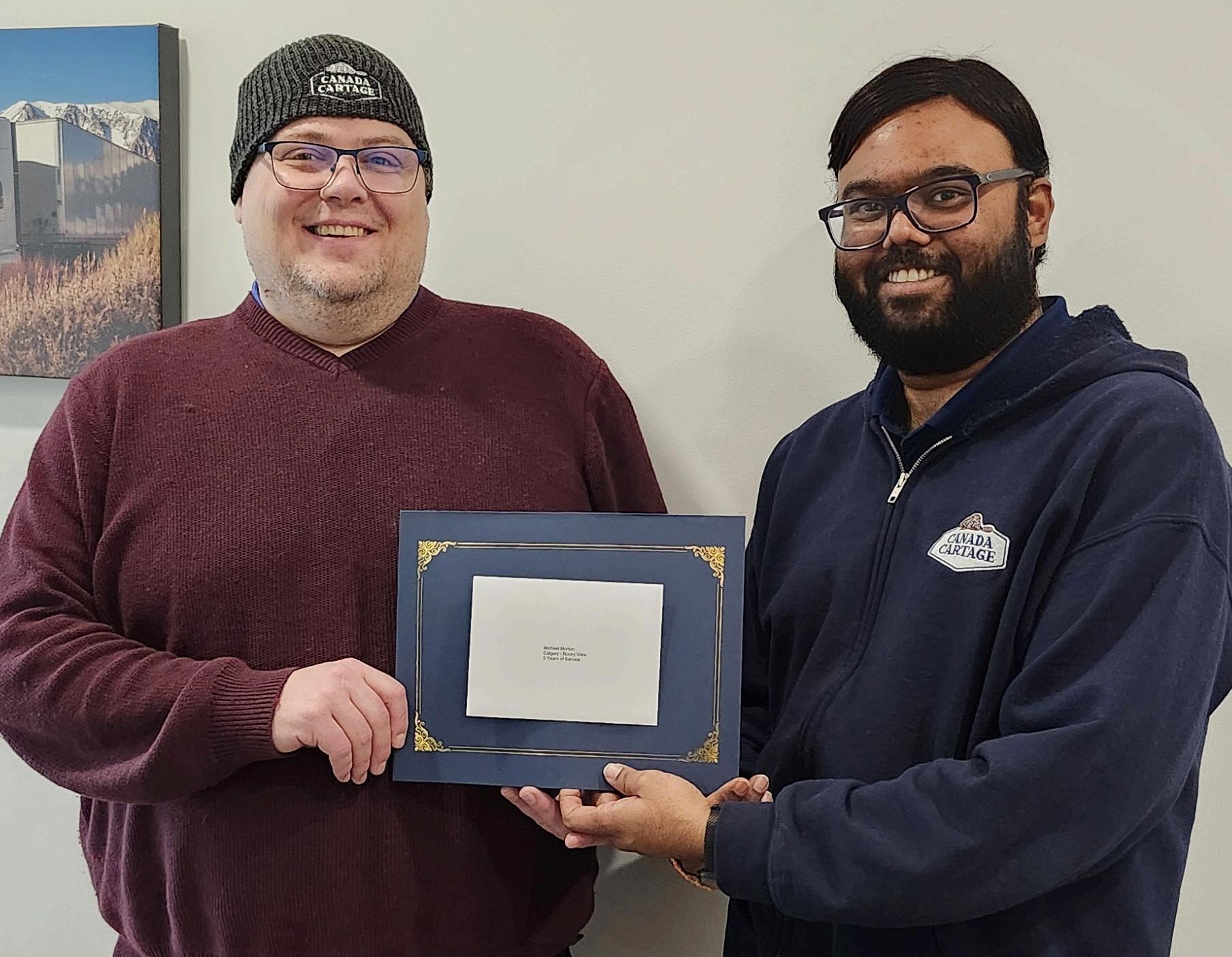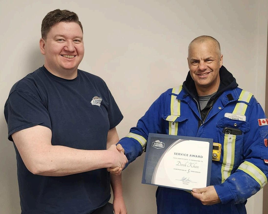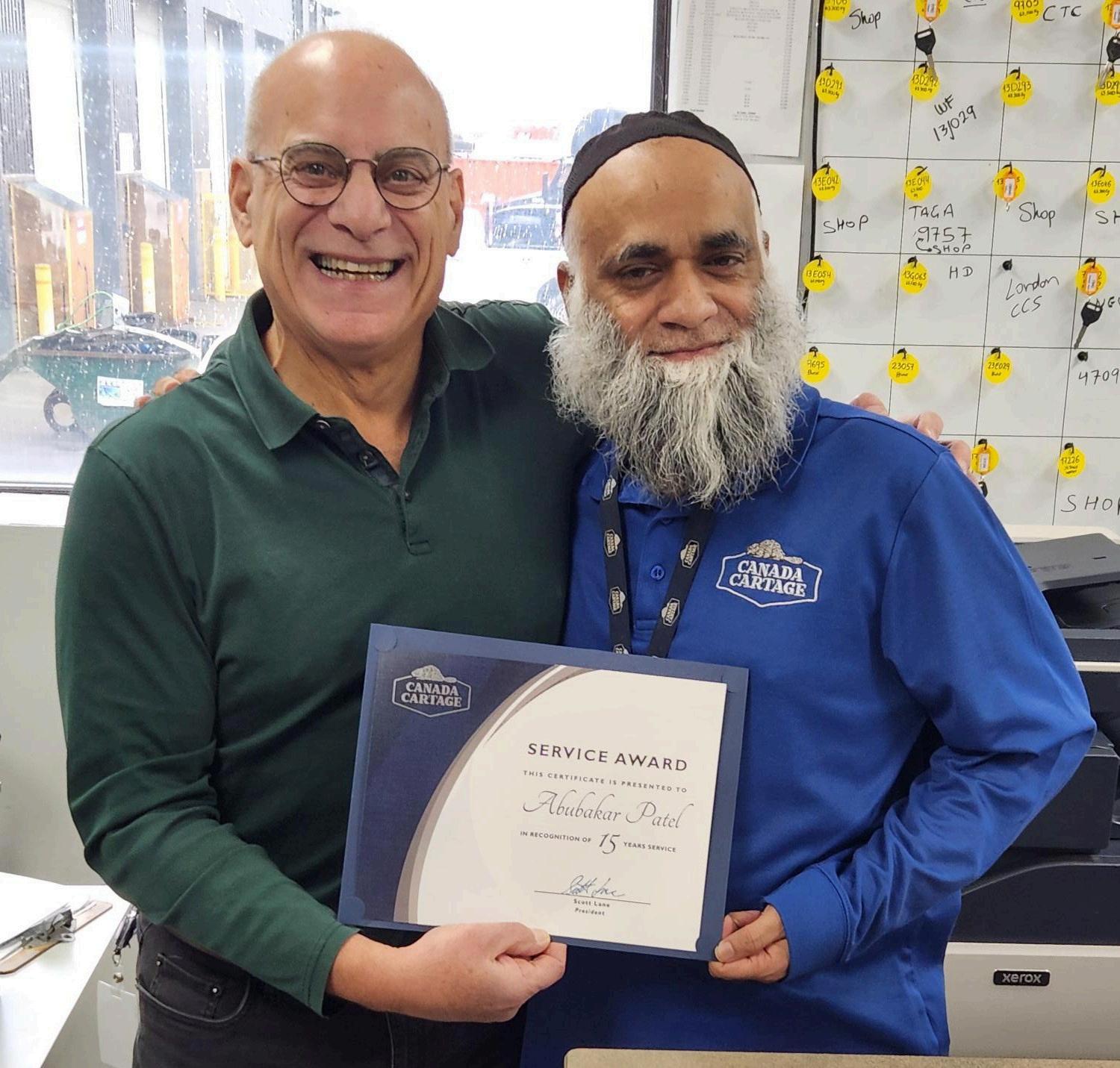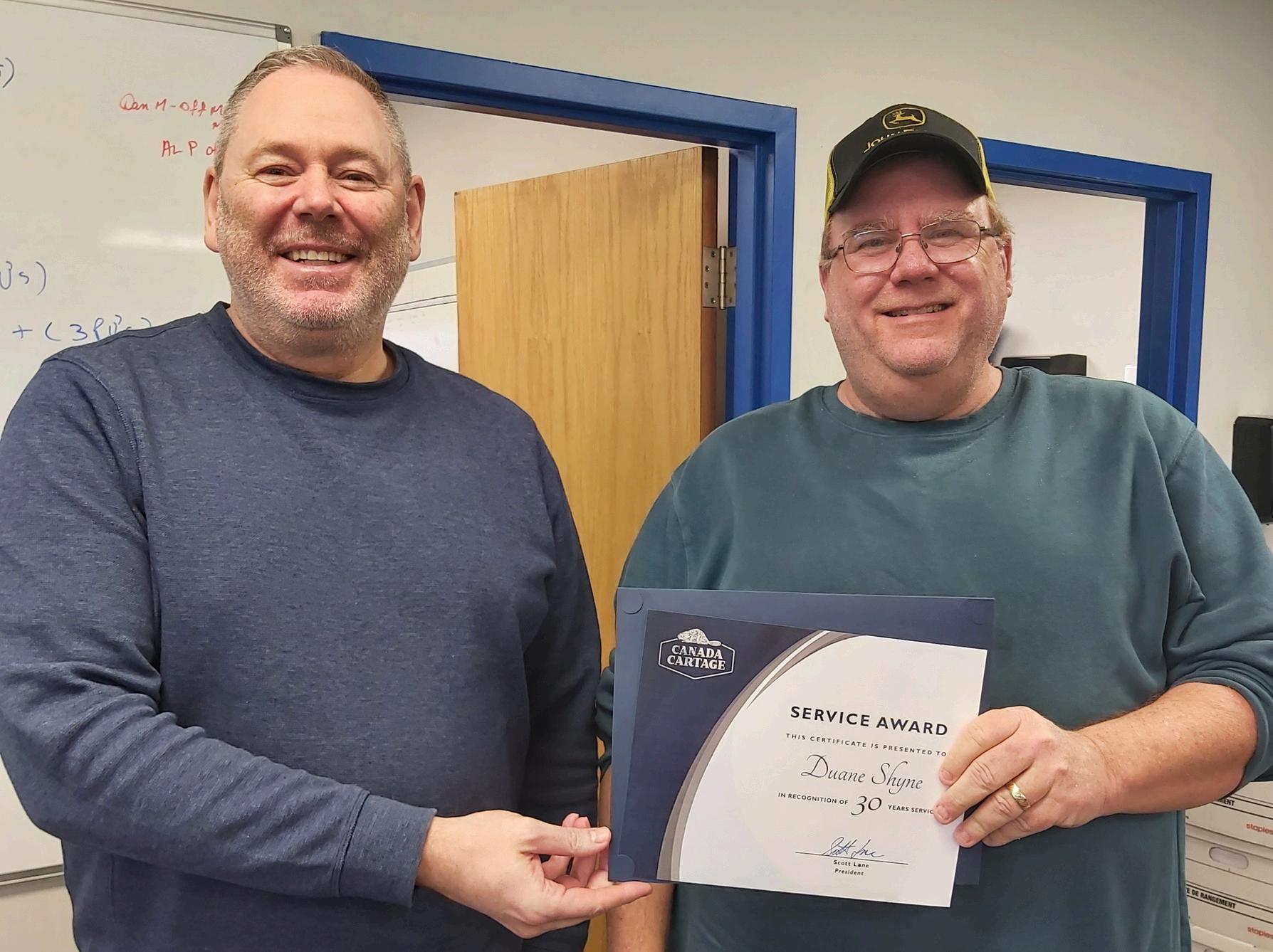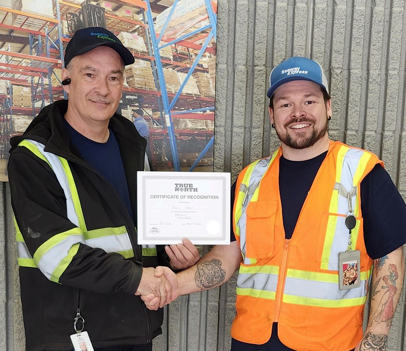 Terminal Manager Steve Godsmark (left) presented Operations Manager Duane Shyne with his 30-year service anniversary certificate. Steve and Duane work out of our Oshawa, Ontario, terminal.