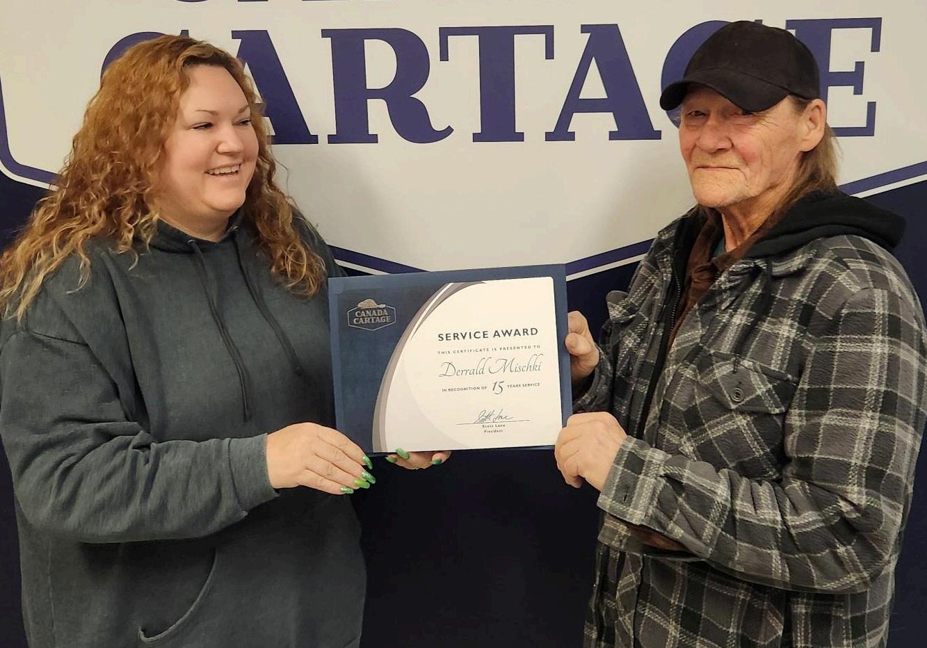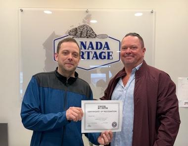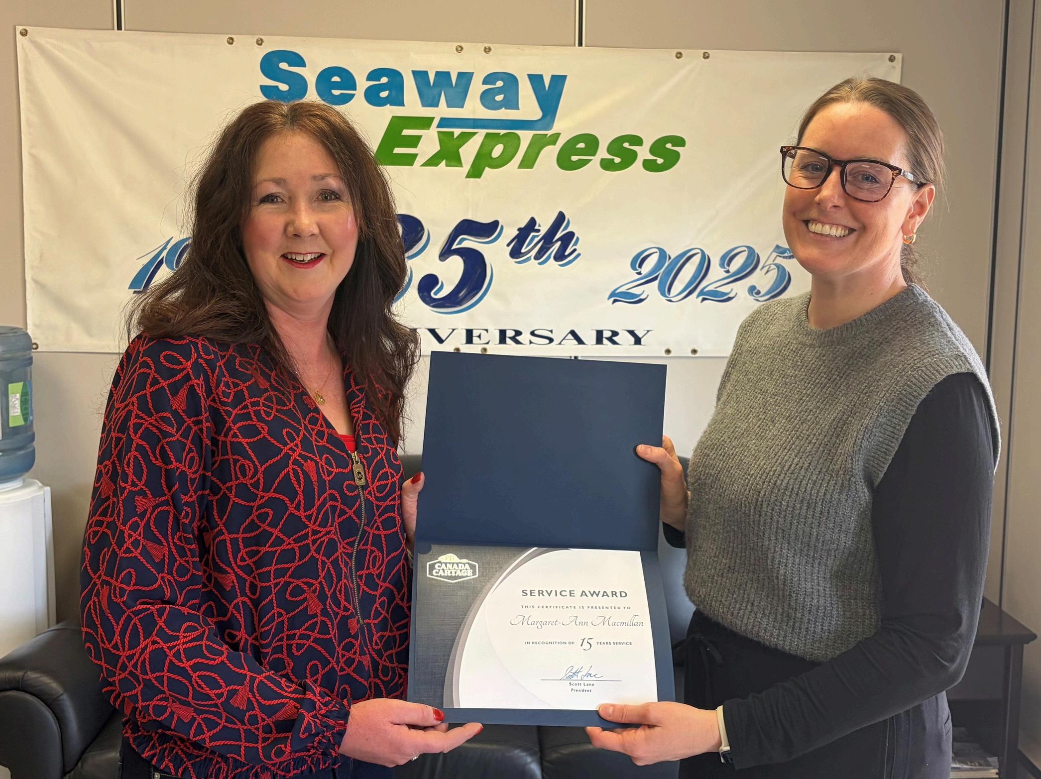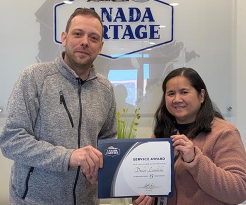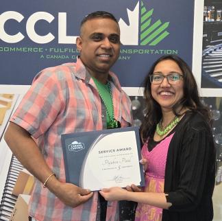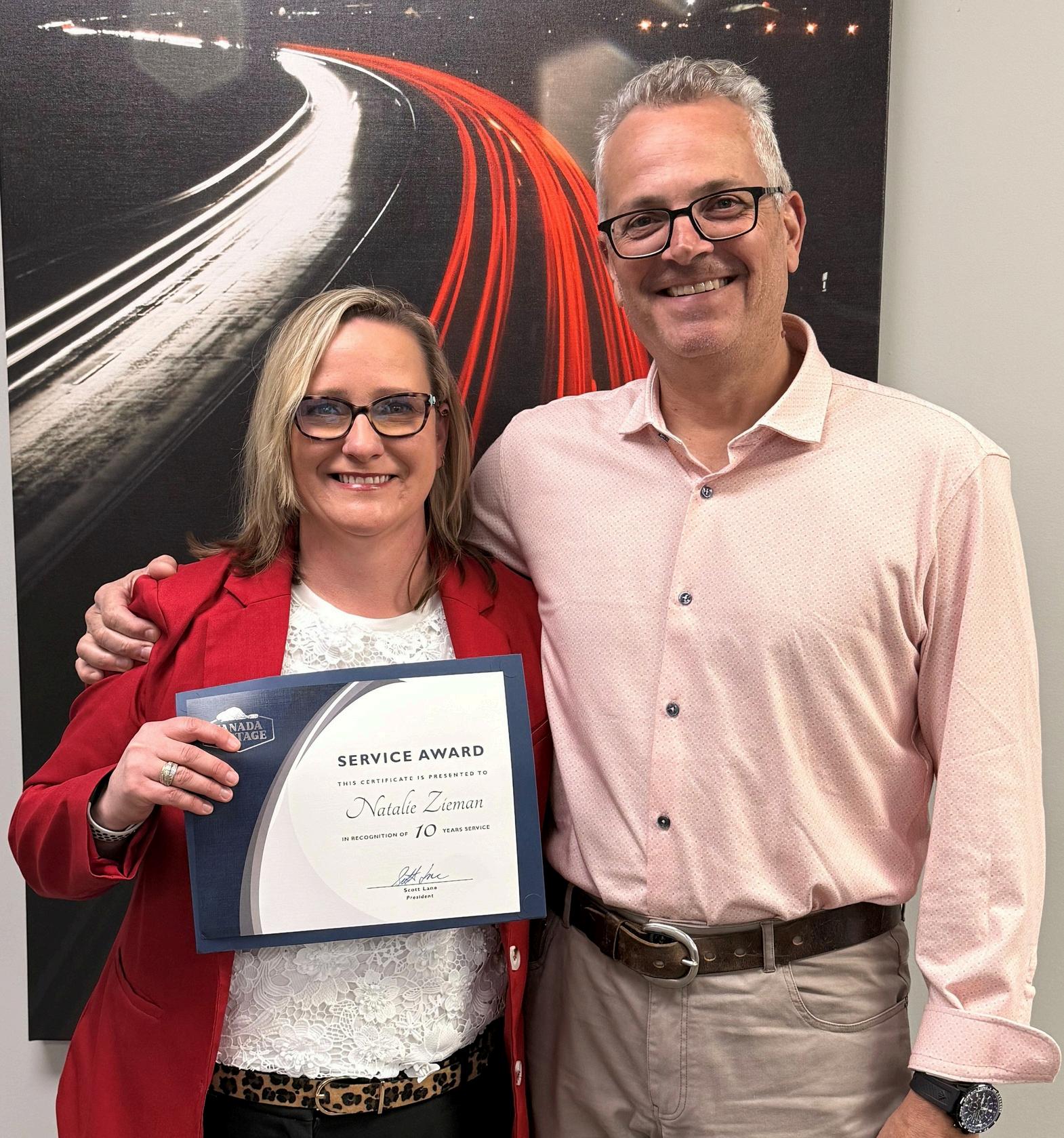 Company President Scott Lane (right) presented CCLS Senior Vice President of Logistics Natalie Zieman with her 10-year service anniversary certificate. Natalie works out of our warehouse location in Brampton, Ontario.