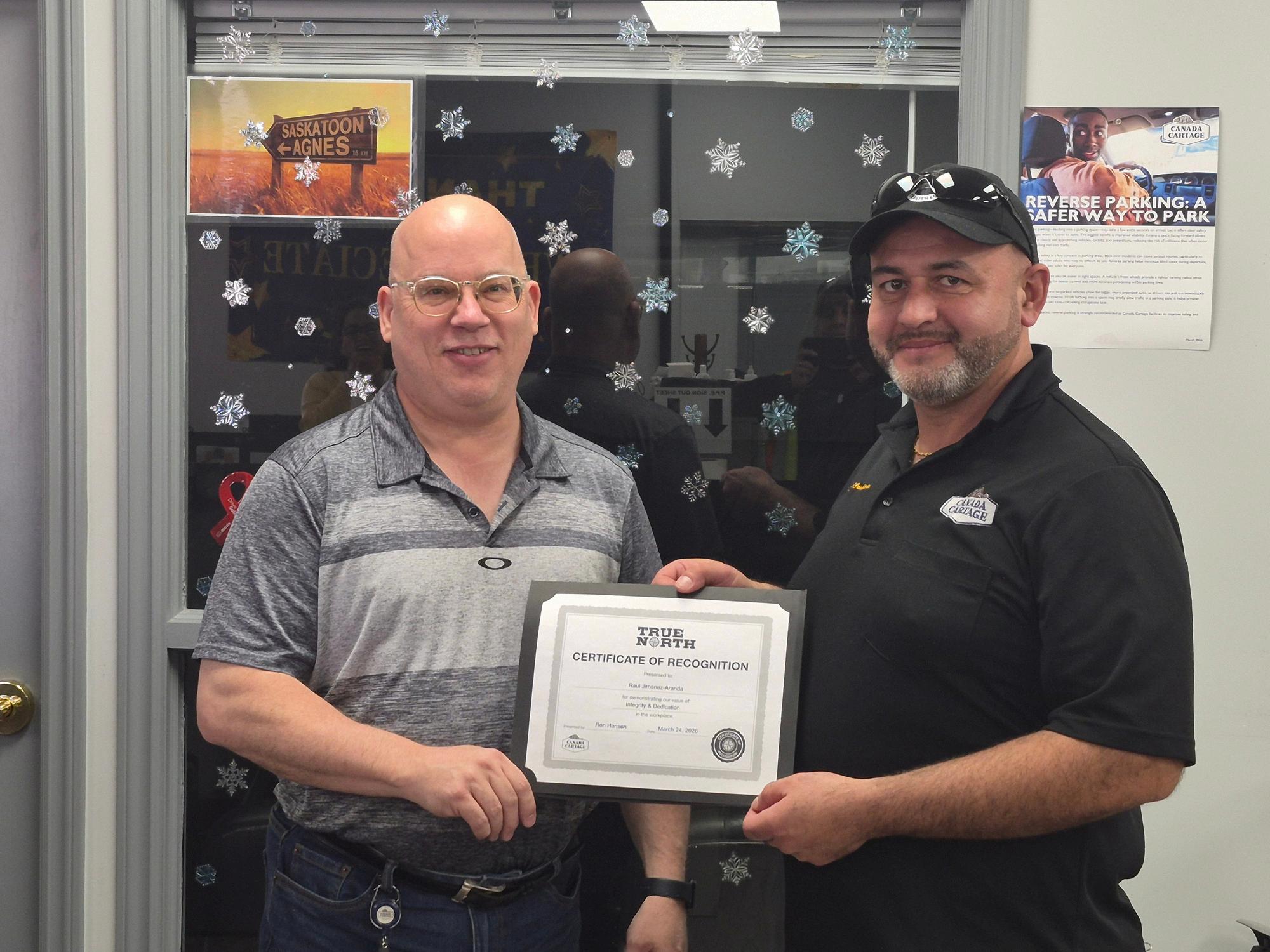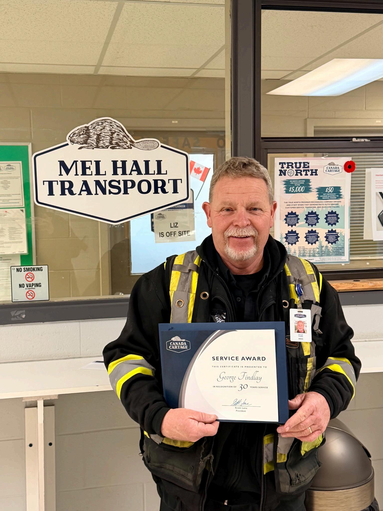 Company Driver John Giles was presented with a True North Certificate for demonstrating our company ’ s values. John works out of our terminal in London, Ontario.