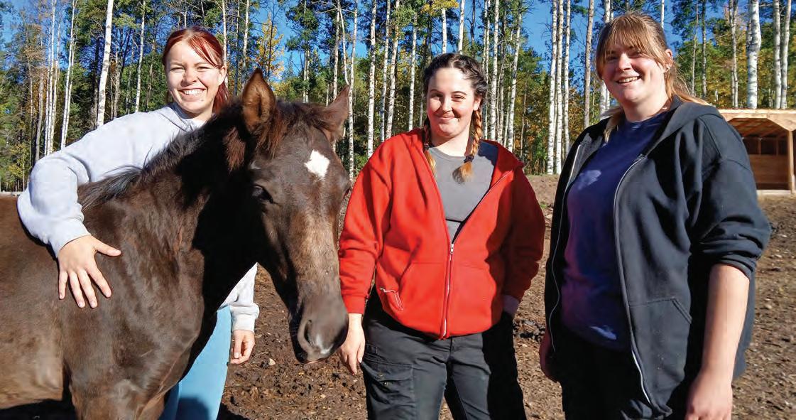 participants, Julia Roth from Germany; Kyanna Gilks from Nova Scotia; and Janika Neumann from Germany, with foal Miles, who was rescued at two days old alone in the forest.