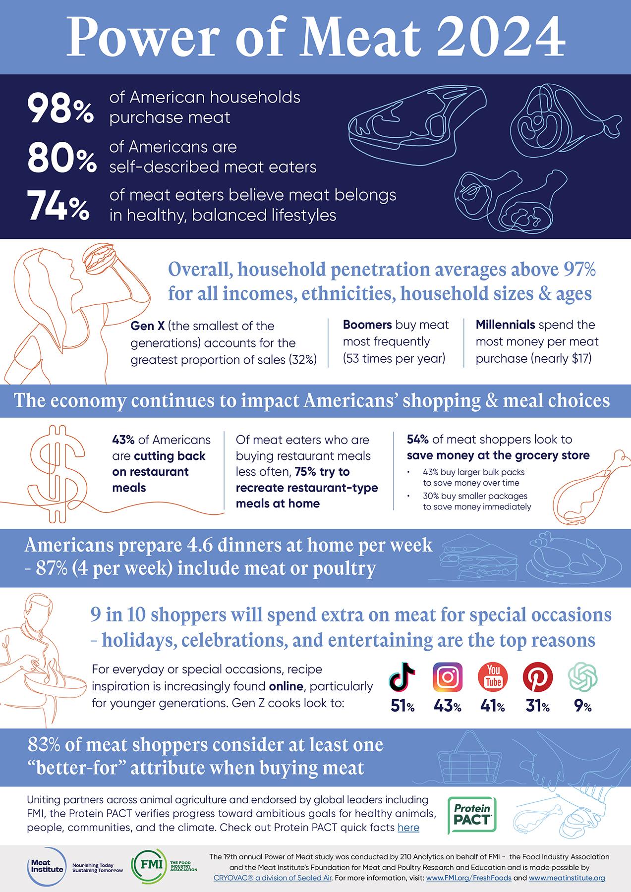 The number of Americans who describe themselves as meat eaters (80%) and the number of households that purchase meat (98%) remain steady from 2023, while the number seeking to decrease meat consumption has fallen by 20% since 2020, according to the 19th annual Power of Meat report released by the Meat Institute and The Food Industry Association (FMI).