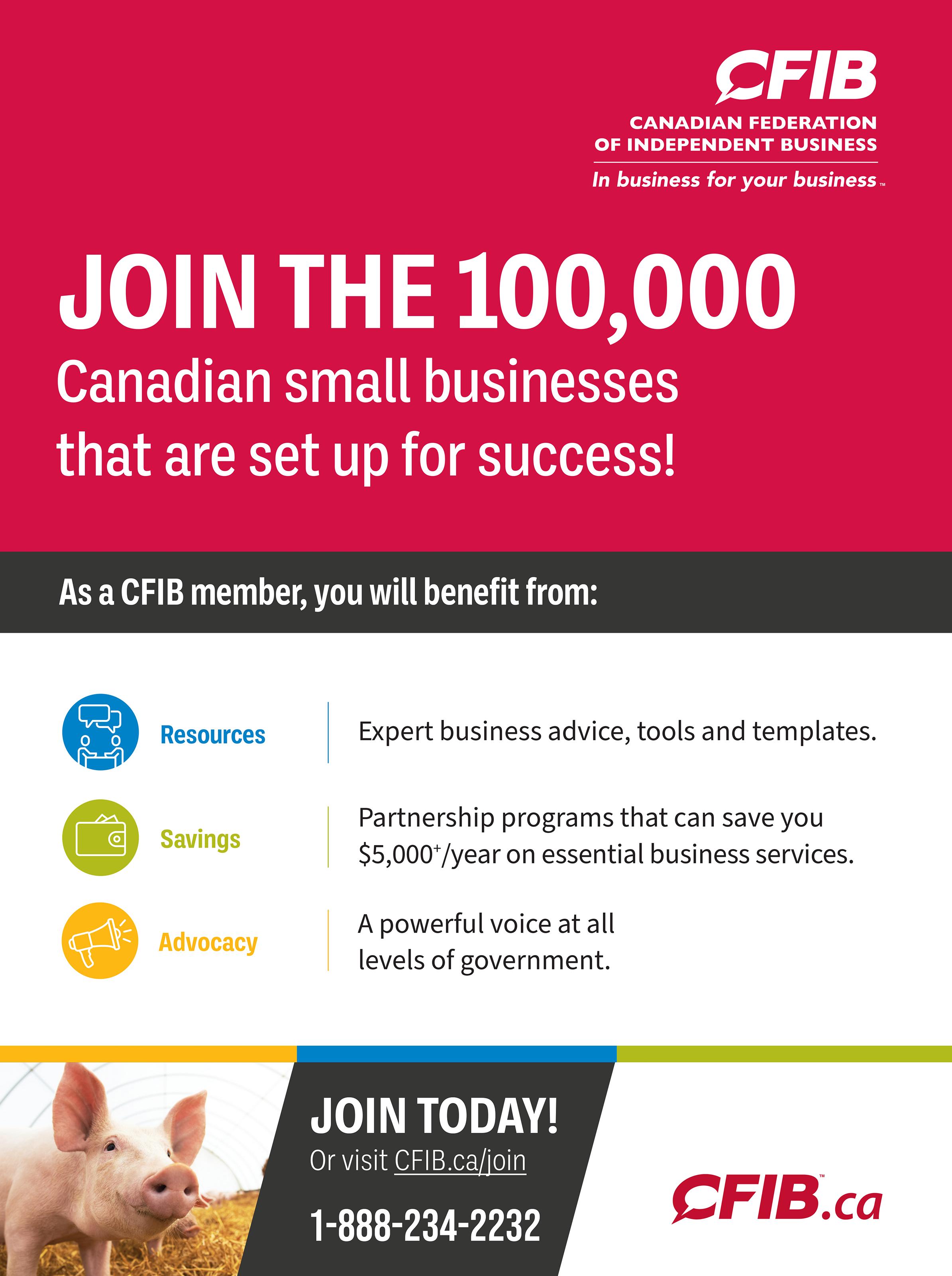 CFIB is Canada’s largest association of small and medium-sized businesses with 100,000 members (6,000 agri-business members) across every industry and region. CFIB is dedicated to increasing business owners’ chances of success by driving policy change at all levels of government, providing expert advice and tools, and