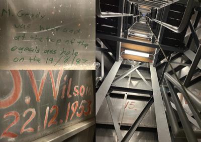 Some colourful graffiti Inside Canberra’s 79-metre-tall Australian-American eagle.