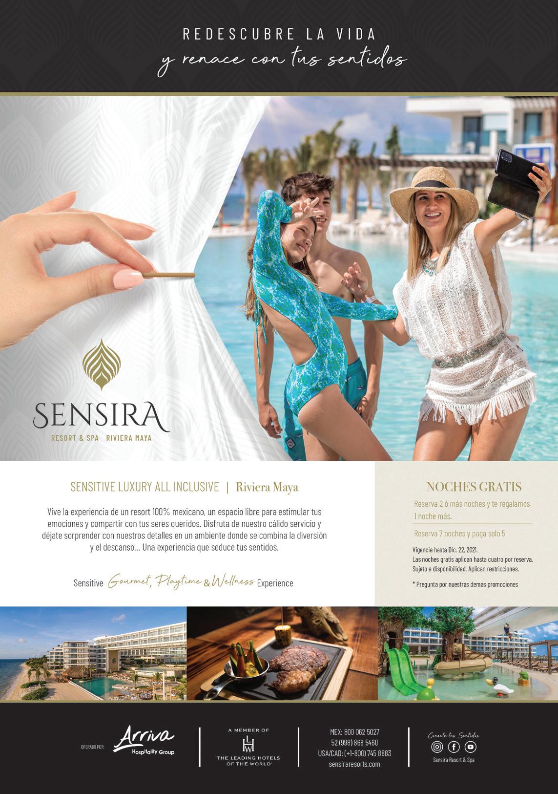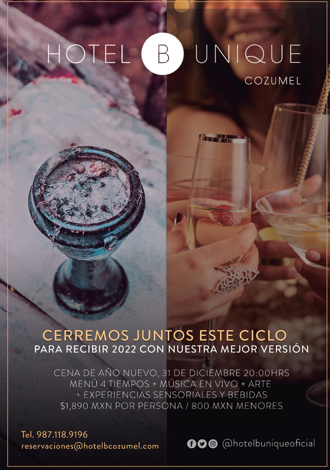 DICIEMBRE 2021 CANCUNÍSSIMO.cancunissimo@cancunissimo.comwww.cancunissimo.mx+52(998)8876010Año30Nº341Diciembrede2021. Re vista mensual editada y distribuida por CANCUNÍSSI MO, S.A. de C.V. Tel y fax: +52 (998) 887 6010, C. Cereza 26-1, Supermanzana 2-A, Lote 7 Manzana 10 C.P. 77500. Editor responsable: Vicente Alvarez Cantarell. Correo electrónico: vac@cancunissimo.com. Certificado de Licitud de Título No. 9463, Certificado de Licitud de Contenido No. 6619. Reserva al Título en Derechos de Autor Nº 04-2012-032913435100-102. Impreso en: Nu Press Printing, Inc., 2050 North West 94th Ave, Miami Florida, Code CANCUNÍSSIMO33172.es un foro abierto. El contenido de sus páginas de ninguna manera expresa el punto de vista de sus editores, sino que son los autores los úni cos responsables de sus artículos. Queda prohibida la reproducción parcial o total del material editorial y gráfico publicado en esta revista. CANCUNÍSSIMO no se responsabiliza por el material no solicitado, ni por la devolución del mismo. Los concursos, sorteos o promociones que aparezcan dentro de los anuncios publicitarios son responsabilidad del anunciante. VICENTE ALVAREZ CANTARELL Director vac@cancunissimo.comGeneral MARGARITA ALVAREZ CANTARELL Directora margarissima@cancunissimo.comAsociada Carlos Matus Coordinador cmatus_foto@hotmail.comeditorial: Charo Vital Asesor editorial Ariadna Servín Coordinadora de sociales@cancunissimo.comSociales Vladimir Ronquillo Sardá webmaster@cancunissimo.comWebmanager Paulina Santana Community Manager Manuel Padilla Arte y arte@cancunissimo.comProyectos Jeniffer Mendía Zamora Gerente de jenny@cancunissimo.comComercializaciónCOMERCIALIZACIÓN Ma. Dolores Velarde lole@cancunissimo.com Carlos Alberto Vázquez cvazquez@cancunissimo.comFOTÓGRAFOS Víctor Hernández DISTRIBUCIÓNCancún Rucel Itzá Mérida Ofelia Alvarez Cantarell (999) 947 51 72 Cancunissimo1Cancunissimo EDICIÓN DICIEMBRE 16-17 Caribe mexicano, elperfectoescenario 22-24 Guía de regalos 26-27 Cuida tu belleza 28-29 Casa Rolandi 46 Fuegos Artificiales38-39 El origen de la navidad La metaformosis del mundo postpandemia ha generado una naciente consciencia ambiental, que inspira a muchos al cuidado y la conservación de nuestras riquezas. PÁGS 41-43 MAYA KA’AN, RECONECTARSE CON EL MUNDO