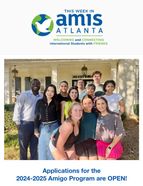 ApplyTODAYforyourspotinour2024-2025AmigoFriendship Program!Thisopportunitygivesinternationalstudentsthechance tobepairedwithalocalvolunteer,sparkingafriendshipwhere languages,stories,cultures,andexperiencesaresharedwithone another.Thisfriendshipmightincludebeinginvitedintothehomeof yourAmigo(theSpanishwordfor"friend")forameal,grabbinga coffeenearcampus,orparticipatinginacommunityeventtogether. Thisfriendshipismeanttobeasafeplacewhereyoucanask questionsaboutlifeinAmericawhilelearningfromoneanother.