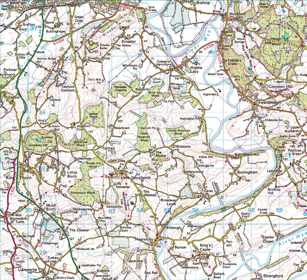 2 2.5km – Turn left, following signs to Bogmarsh, Aconbury and Newtown. Continue up a long hill for 4km to reach an offset crossroads.