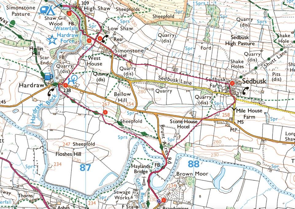 3.4km – At the road turn left and walk with care into Simonstone. On a bend take the footpath on the left, signposted Sedbusk. Join the far track and continue past some barns. After the barns, continue straight ahead for half a mile over a succession of fields to Sedbusk.