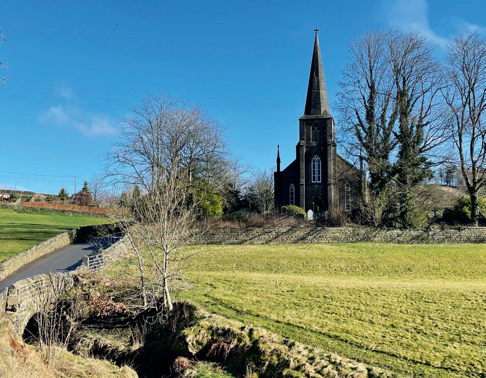 10.9km – turn right at the T-junction and continue into Cotton Stones, passing the church on your left, then