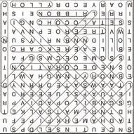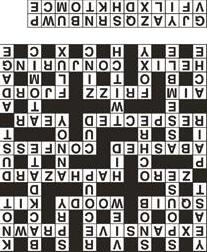 This puzzle has no clues in the conventional sense. Instead, every number printed in the main grid represents a different letter (with the same number always representing the same letter, of course). For example, if 8 turns out to be a V, you can write in V wherever a square contains 8.
