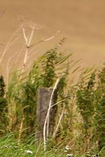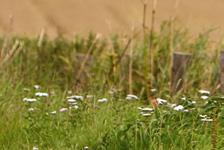 1.1km – Continue through the gate at the corner of the copse, following a fenced grassy track uphill through another gate,
