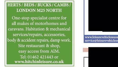 One-stop specialist centre for all makes of motorhomes and caravans. Habitation & mechanical services/repairs, accessories, body & accident repairs, damp work. Site restaurant & shop, easy access from AIM. Tel: 01462 421443 or www.hitchinleisure.co.uk
