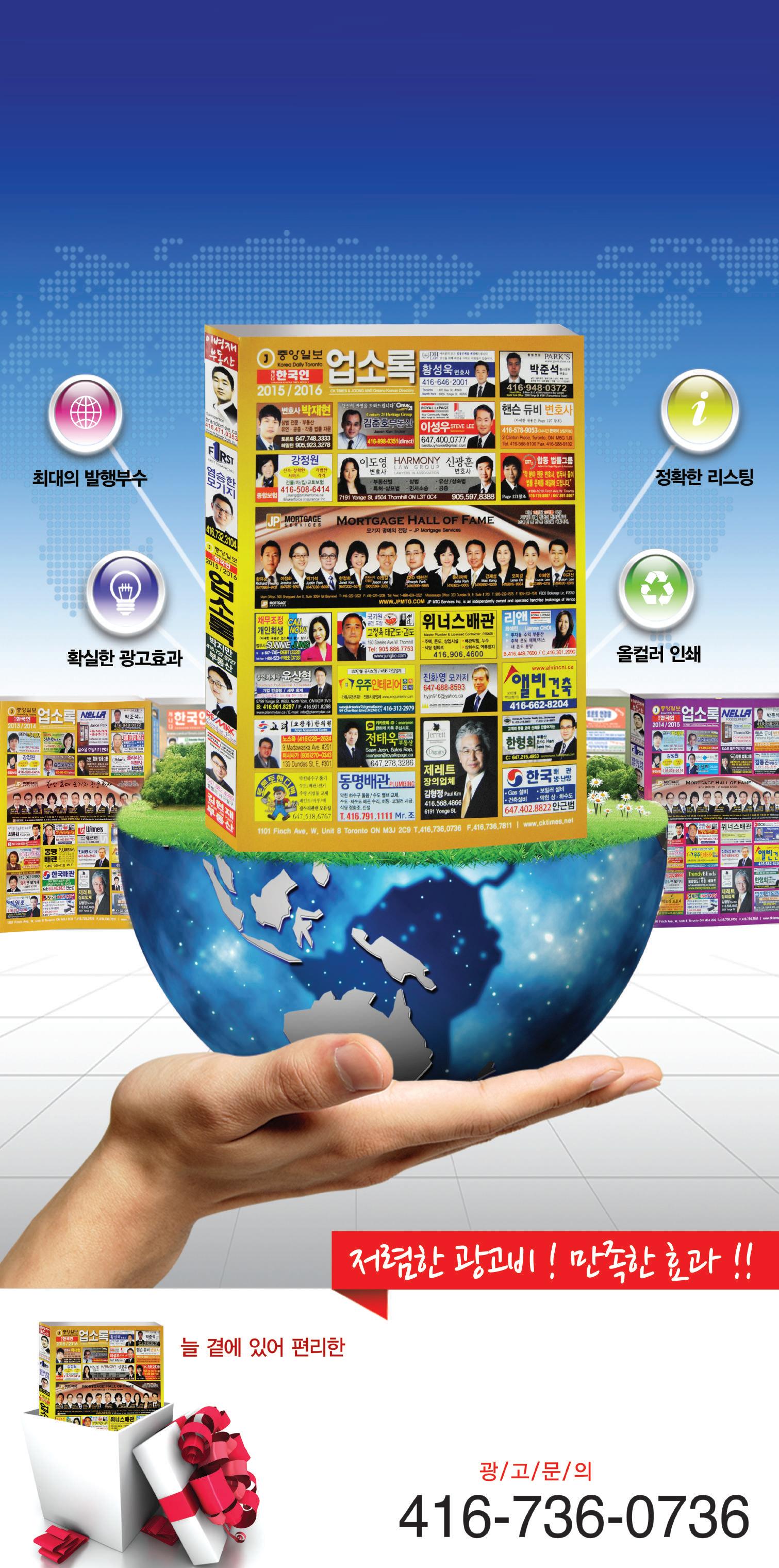 중앙일보와 한국인이 함께 만드는 업소록! 416-736-0736 광고 문의 1001 Finch Ave. W. #204 Toronto Ontario Canada M3J 2C7 bd@cktimes.net 광고, 지금 기회를 놓치면 1년을 기다려야 합니다. 최고의 광고효과 웹사이트 자동 업데이트