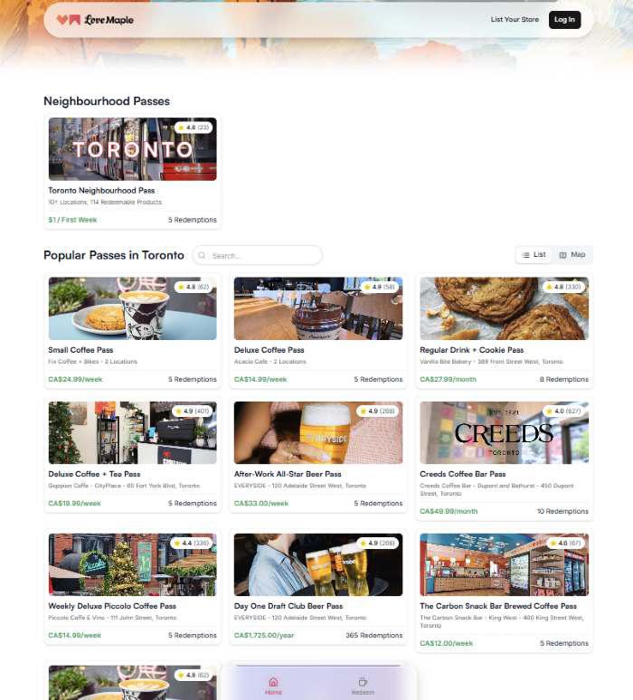 토론토의 소프트웨어 엔지니어 넬슨 리(Nelson Lee)와 해리 브 라운(Harry Brown)은 지난해 11 월, 개인 카페와 레스토랑을 위 한 구독 플랫폼 '러브 메이플'을 선보였다. 스타벅스나 팀홀튼 같은 대형 프랜차이즈의 모바일 앱 결제 시 스템에 대응하기 힘든 동네 작 은 가게들에게 '디지털 멤버십' 이라는 무기를 쥐여주기 위해서 다. 현재 토론토 시내 13개 매장 이 이 시스템을 도입해 운영 중 이다.