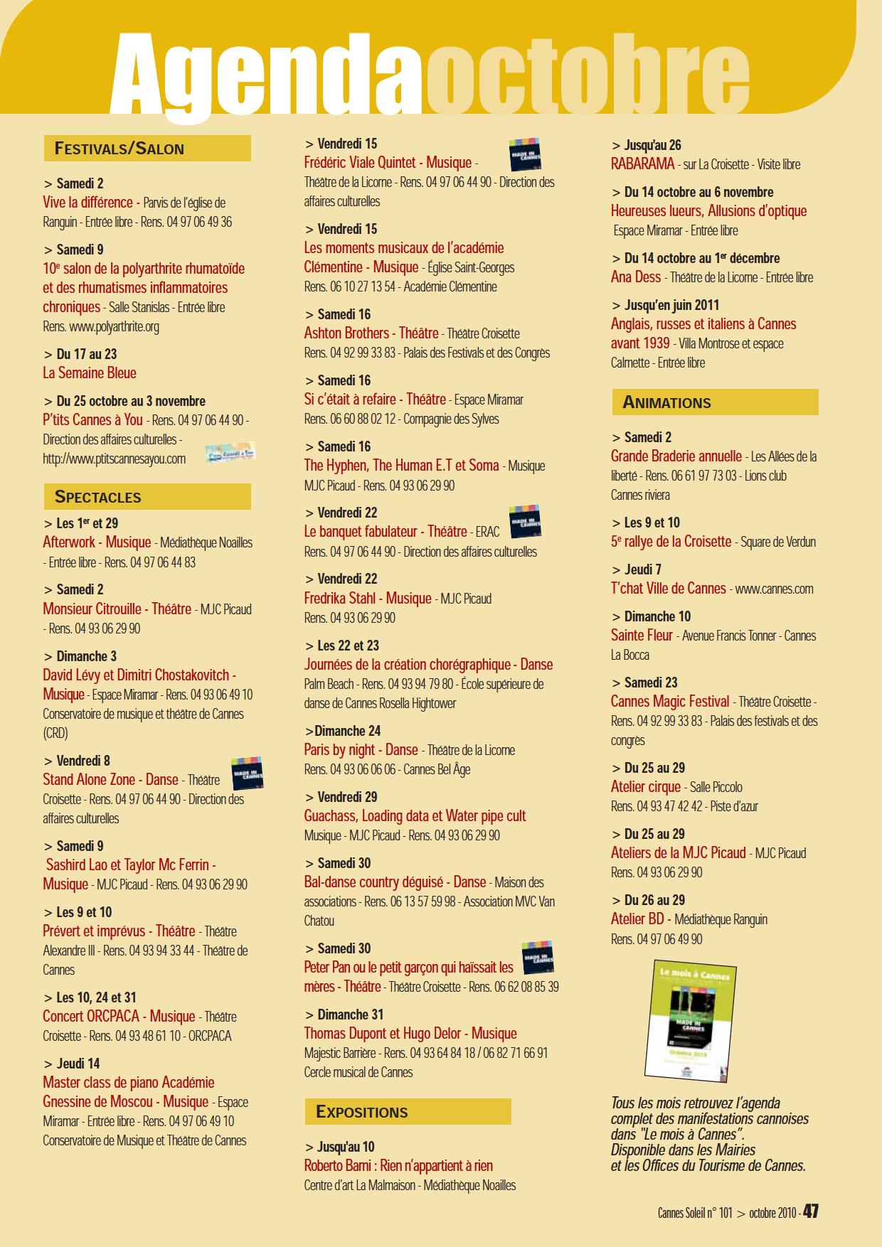 Spéracèdes, Peymeinade, MouansSartoux, Mougins Cannet, cinquantaine d’animations randonnées pédestres, spéléologie, pêche, pédagogiques artistiques, spectacles, expositions, visites, pétanque… ouvrage habitants.
