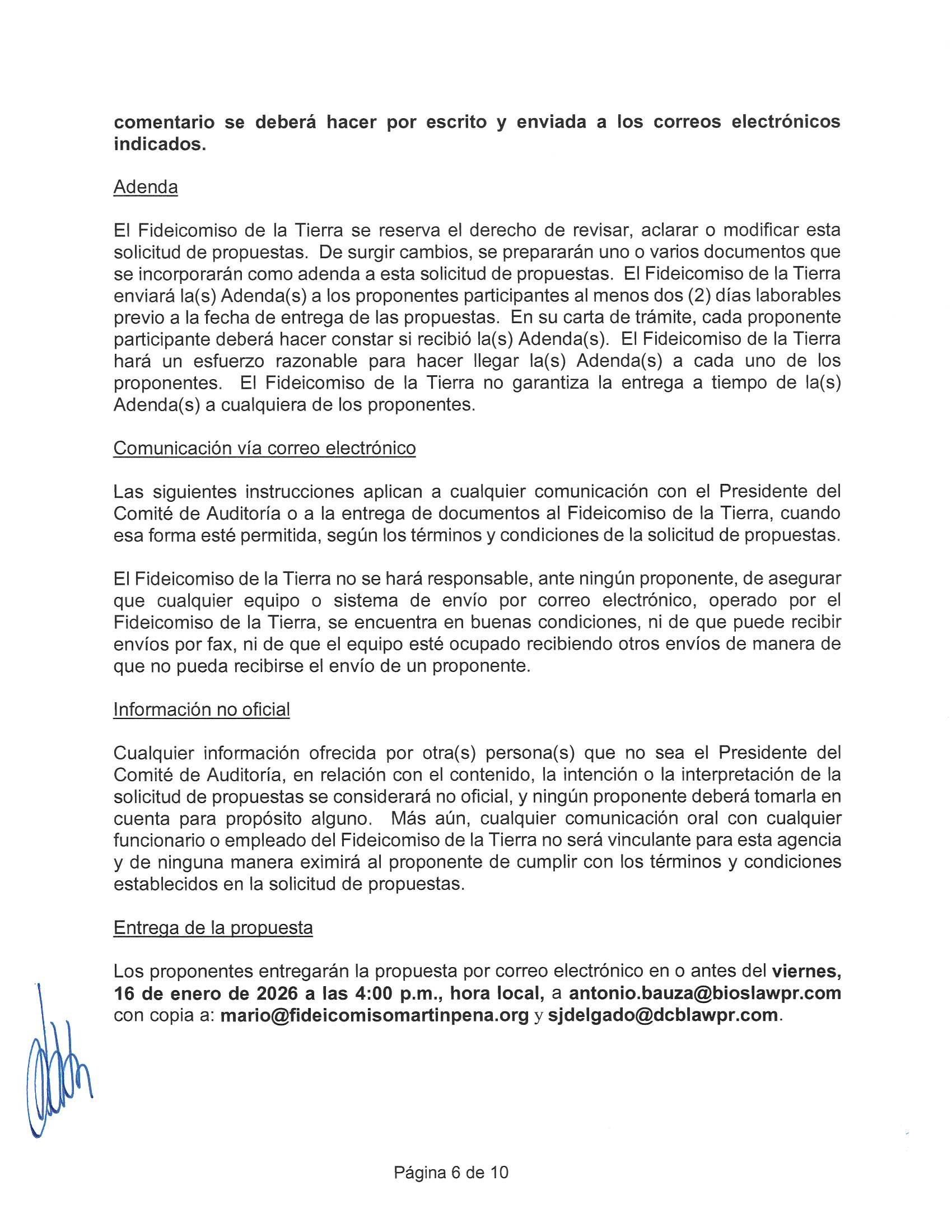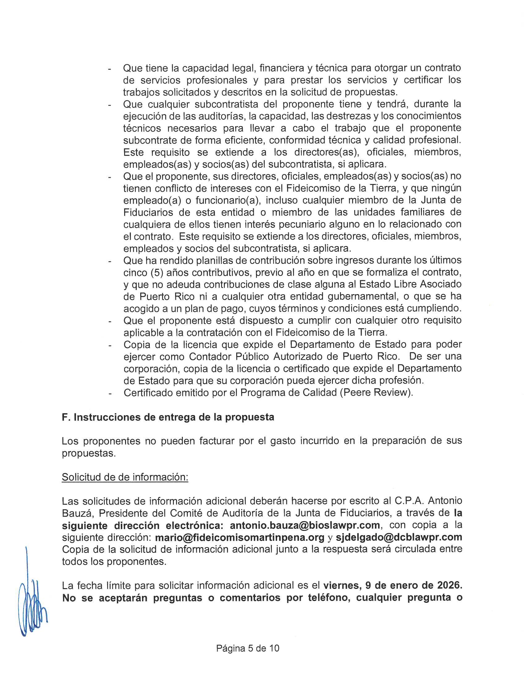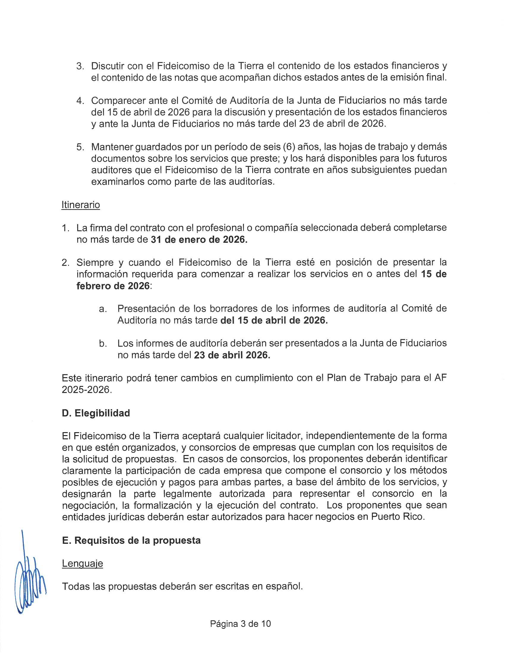 El Fideicomiso de la Tierra del Caño Martín Peña, en adelante el Fideicomiso de la Tierra solicita propuestas para servicios de auditoría de sus estados financieros para el año fiscal terminado el 30 de junio de 2024 & para el año fiscal terminado el 30 de junio de 2025. Los servicios serán provistos principalmente entre el 31 de enero de 2026 y el 30 de abril de 2026, siempre y cuando el Fideicomiso de la Tierra pueda hacer entrega al Consultor la información requerida para realizar los servicios y que el informe de Auditoría de los estados financieros para el año fiscal 2023-2024 y el año fiscal 2024-2025 hayan sido culminados.