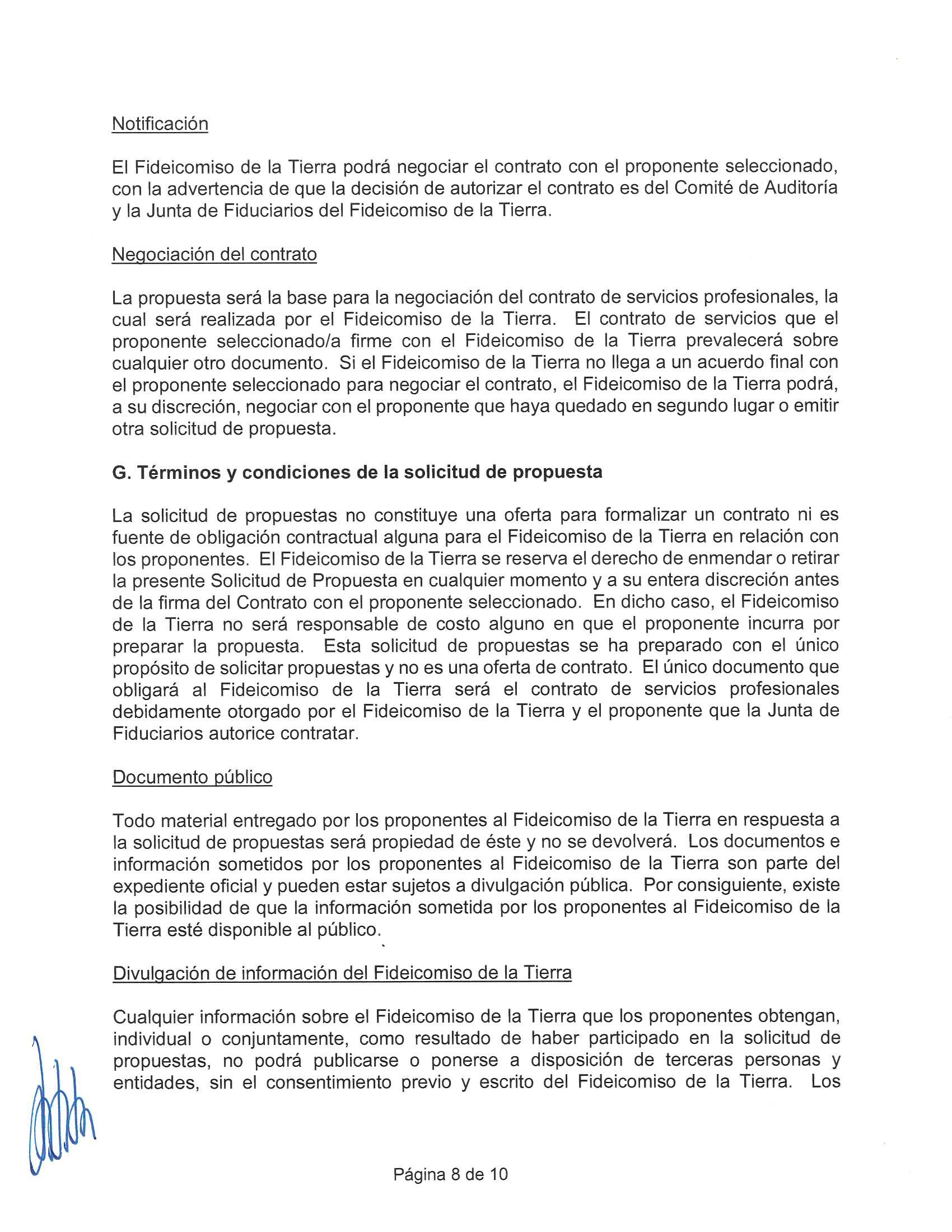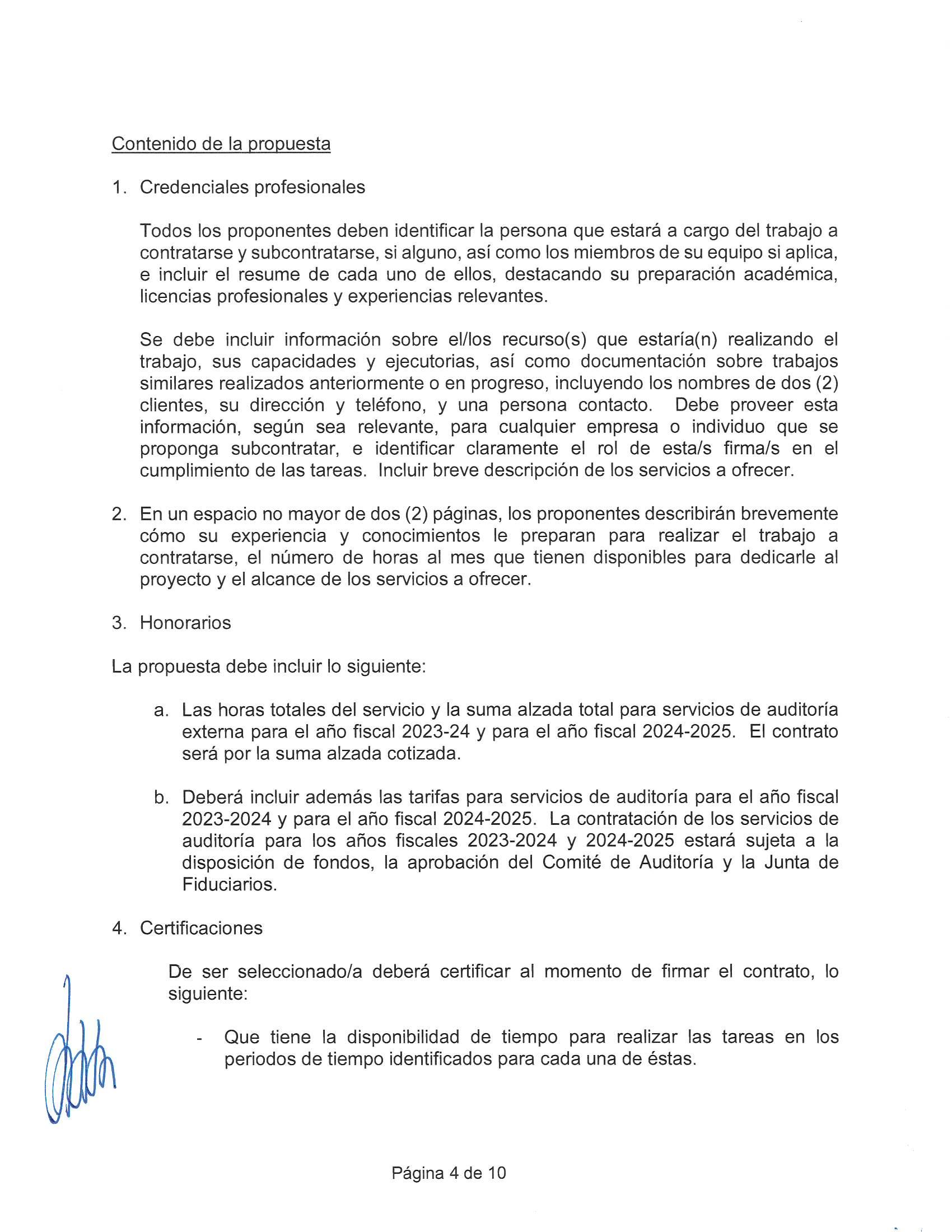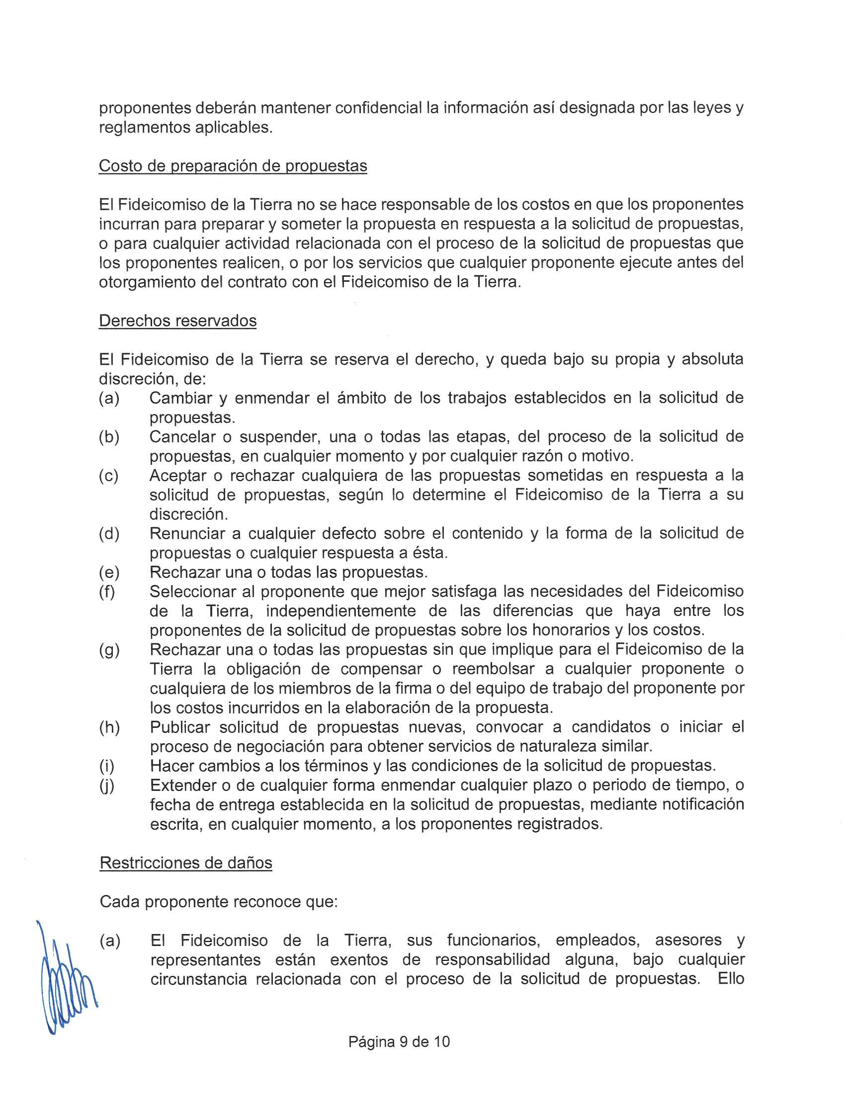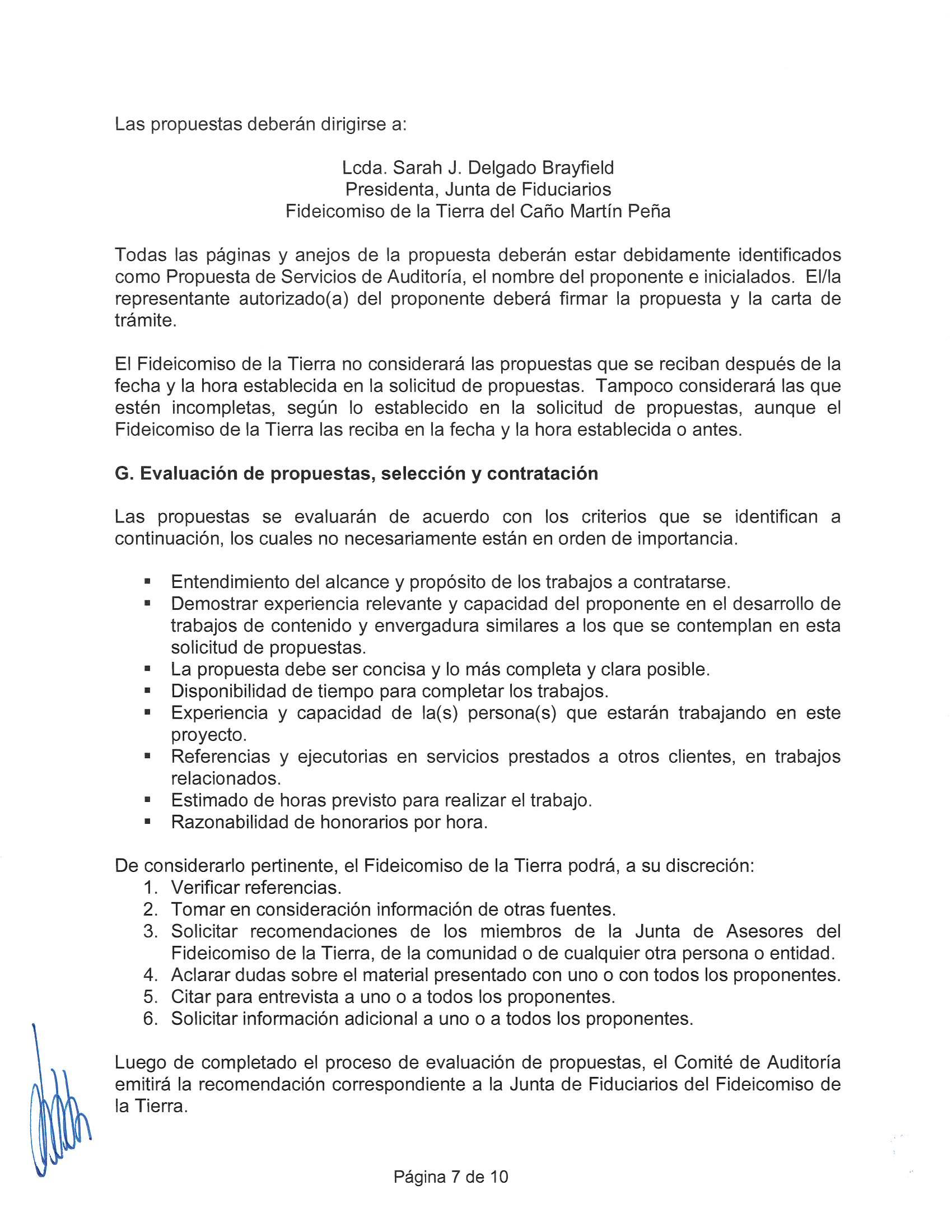 El Fideicomiso de la Tierra del Caño Martín Peña, en adelante el Fideicomiso de la Tierra solicita propuestas para servicios de auditoría de sus estados financieros para el año fiscal terminado el 30 de junio de 2024 & para el año fiscal terminado el 30 de junio de 2025. Los servicios serán provistos principalmente entre el 31 de enero de 2026 y el 30 de abril de 2026, siempre y cuando el Fideicomiso de la Tierra pueda hacer entrega al Consultor la información requerida para realizar los servicios y que el informe de Auditoría de los estados financieros para el año fiscal 2023-2024 y el año fiscal 2024-2025 hayan sido culminados.