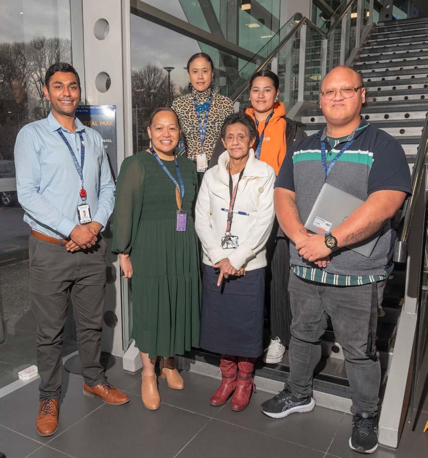 Māori -Intensive Care Ariana Kaa (Ngati Porou/Te Whanau a Apanui) and Hauora Māori Administrator | Kaiwhakahaere Tari Hariata Allen (Ngai Tahu | Te Atihaunui A Paparangi) Front row, from left, Kaimahi Hauora Māori | Māori Health Worker - General Medicine Surgical and Gastroenterology Kiwa Shankar (Ngāti Awa | Ngāi Te Rangi), Kamahi Hauora Māori |Māori Health Worker - Cardio-Respiratory Integrated Specialist Services Maringi Morgan-Parnell (Ratonga Manawa Hā Waikato - Ngāti Hinerangi), Māori Health | Kaiwhakahaere Hauora - Māori Health Service Waitaha Te Pora Ehau (Ngati Porou) and Kaimahi Hauora Māori - General Medicine Tama Te Morehu Ngaha (Waikato-Maniapoto / Ngāti Mahuta)