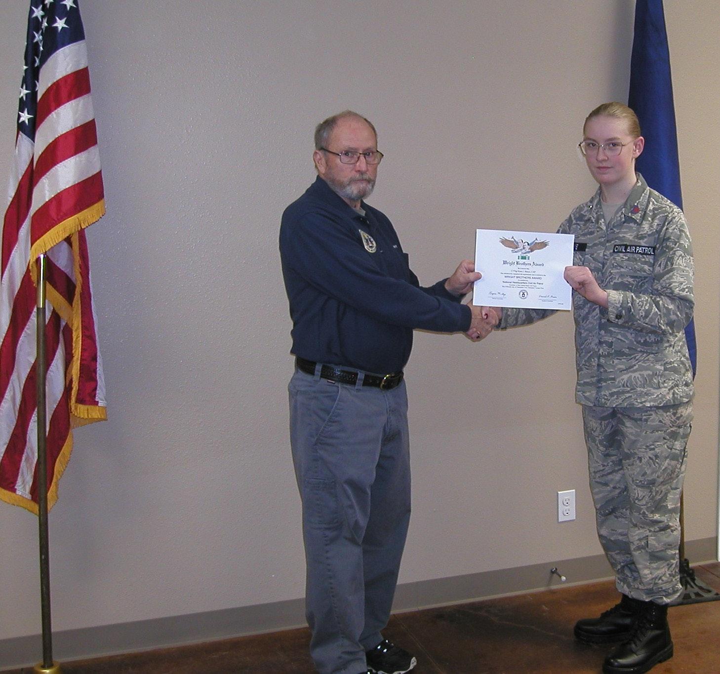 On 2 March 2026, Capt Harry White presented the Wright Brothers award to C/TSgt Kara Basye. Cadet Basye serves as the Flight Sergeant and Cadet Advisory Council representative for Tok Composite Squadron. During the ceremony, Capt White also presented Cadet Cayden Doucet with his Wright Brothers award and promoted Cadet Aiden Gross to C/SrA. Cadet Gross is now studying for his Wright Brothers exam so he can move into Phase II of the Cadet Program.