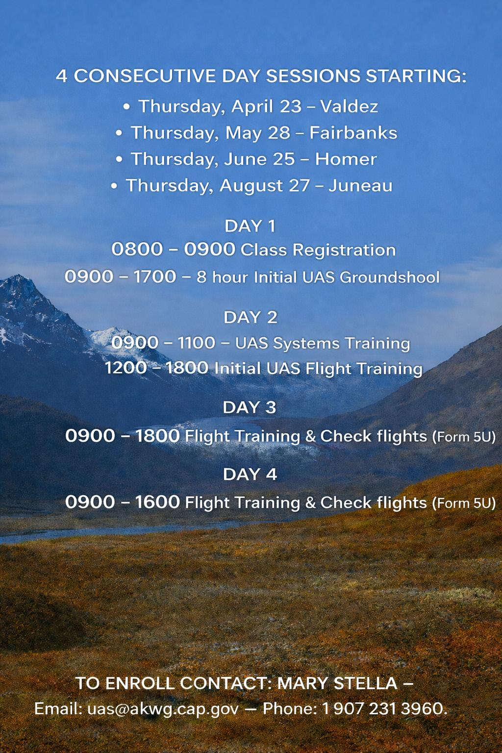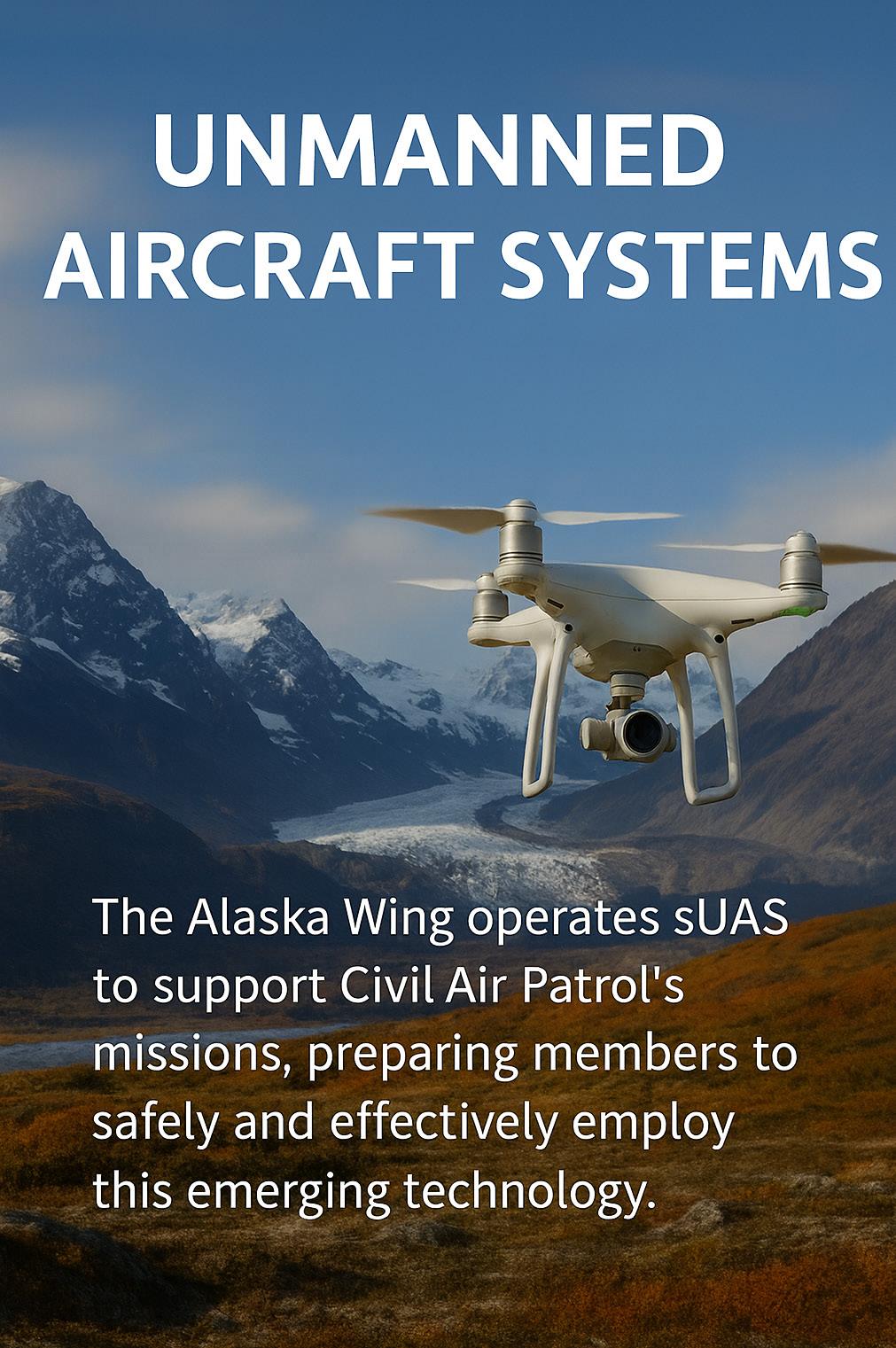 Enthusiasm for this summer’s UAS (unmanned aerial systems) training is high. The earliest registrations have come from squadrons outside the Anchorage Bowl, because our trainers are traveling to any squadron in the state that can assemble 6 or more trainees for the 2 – 4 day sessions. Special thanks to the squadrons that have offered to help our volunteers defray the cost of food and lodging, by offering a bed for the night or sandwiches or a casserole. Much appreciated.