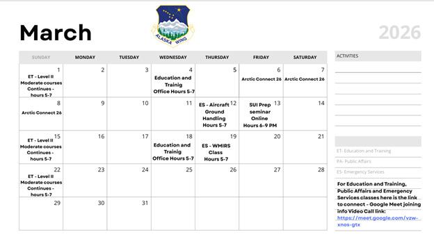 Reminder: each trainee must complete several hours of on-line prerequisites before the first in-person class, so don’t procrastinate. One squadron has decided to dedicate several regular