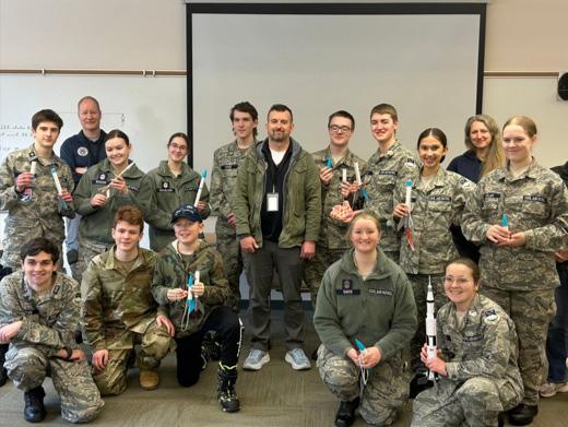Cadets pose with their instructor showing off their model rockets.