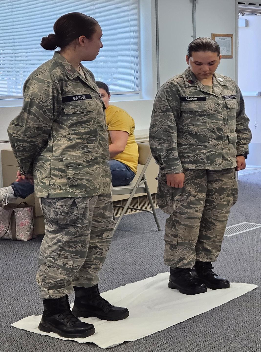 C/MSgt Schmidt shared her experiences at the CAP NCSA Medical Orientation Training School with the squadron. Maj Lorenzana presented a lesson called Character Counts, from the Leadership training guide. Capt. Baugh provided ES instruction in how to inspect a vehicle, and how to properly change a tire. Capt Schmidt supervised a scenario where cadets practiced correct wear and usage of disposable gloves with a cadet “accident victim,” complete with ketchup to make it more realistic.